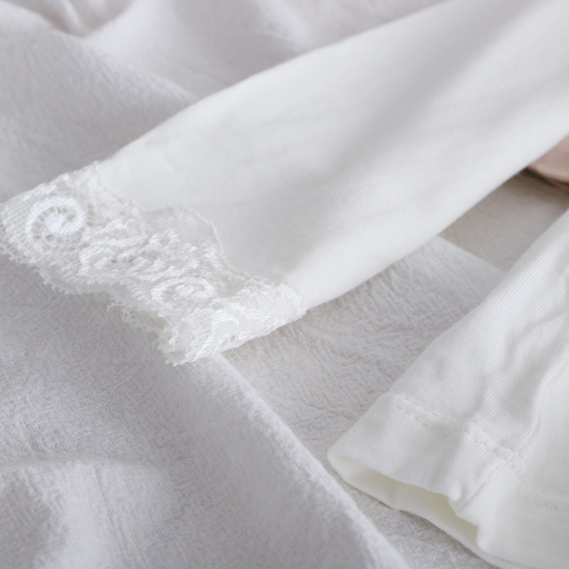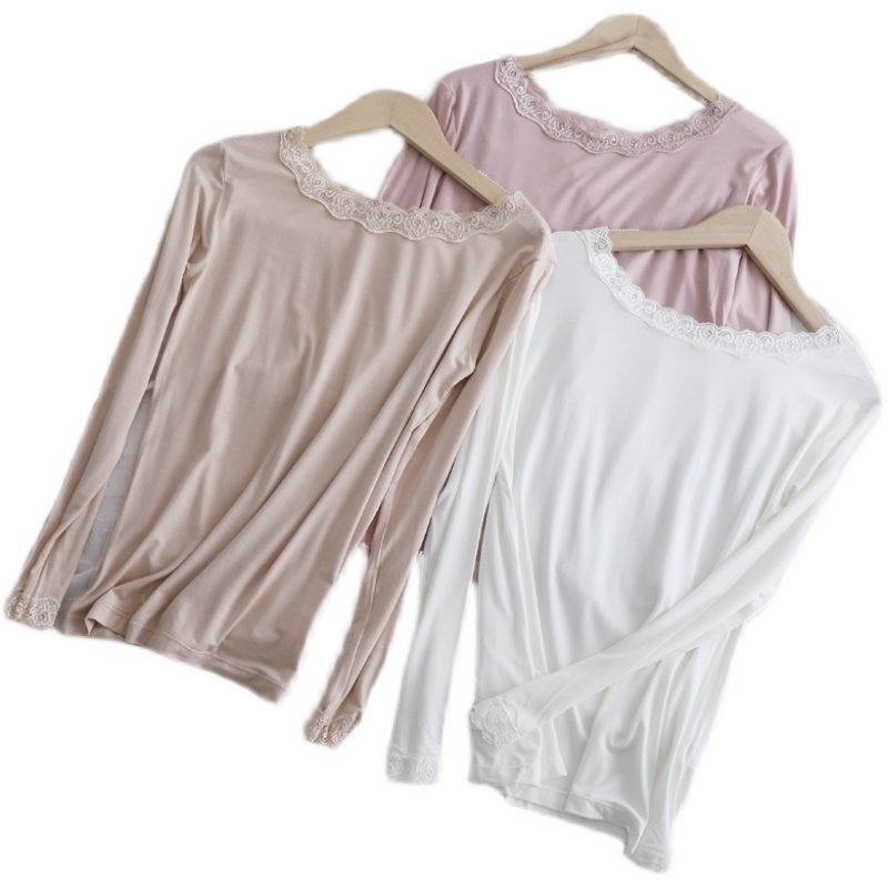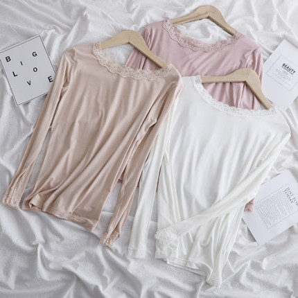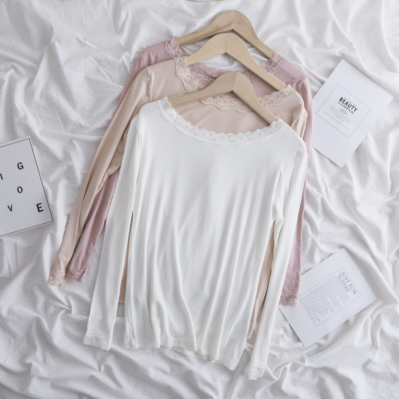 春秋百搭莫代尔蕾丝花边圆领长袖秋冬打底衫女t恤低领女薄款秋衣