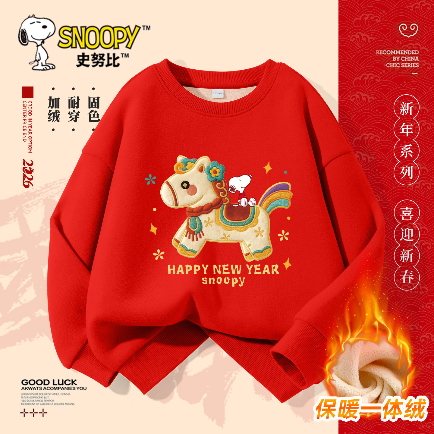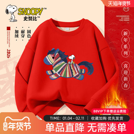 史努比男童红色加绒卫衣2026新款冬男孩马年上衣儿童喜庆过年衣服
