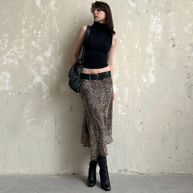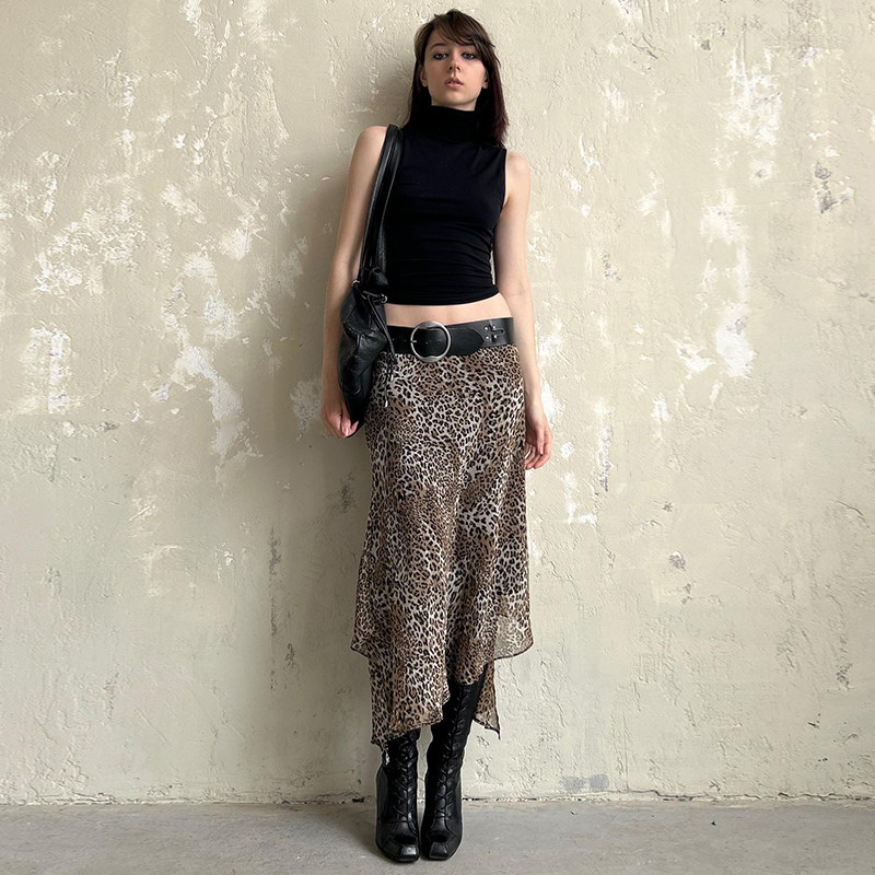SWEETOWN雅痞姐姐#复古豹纹印花不规则半裙欧美辣妹垂感包臀长裙