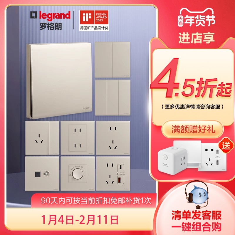 罗格朗开关插座面板简悦粉铂金暗装USB五孔家用隐藏86型墙壁电源