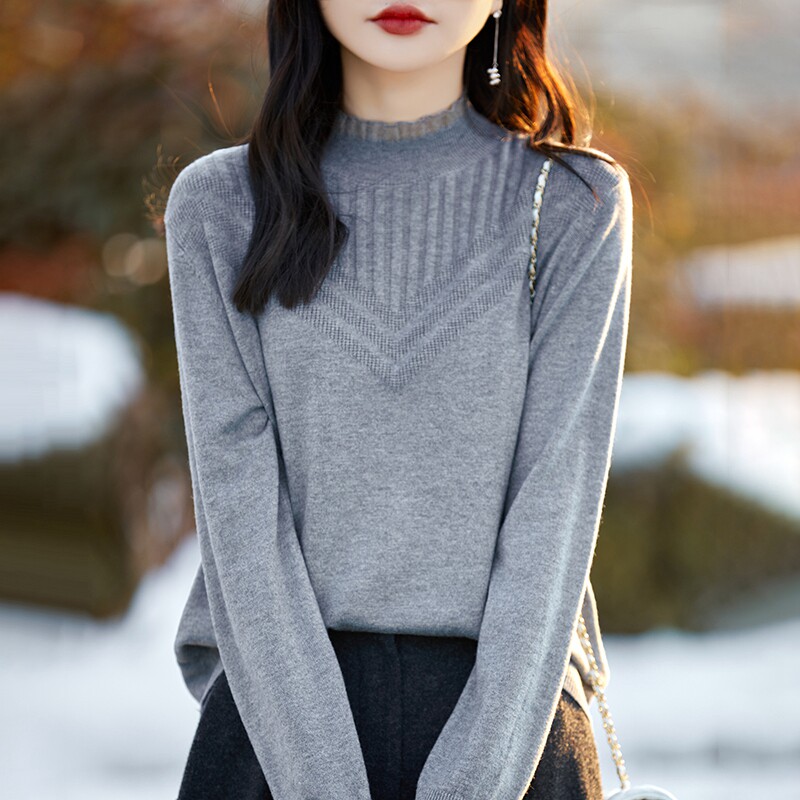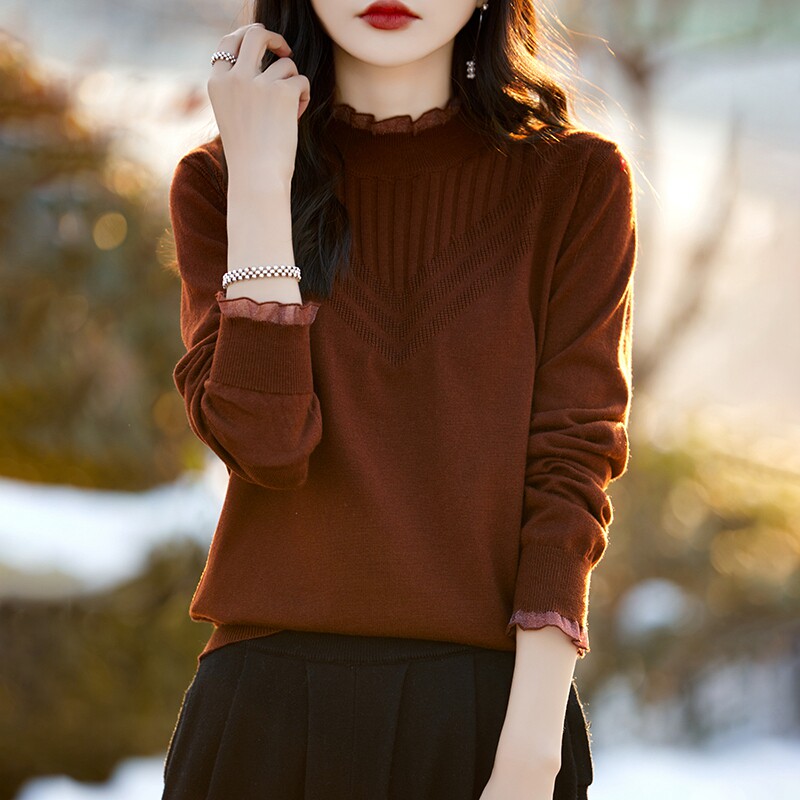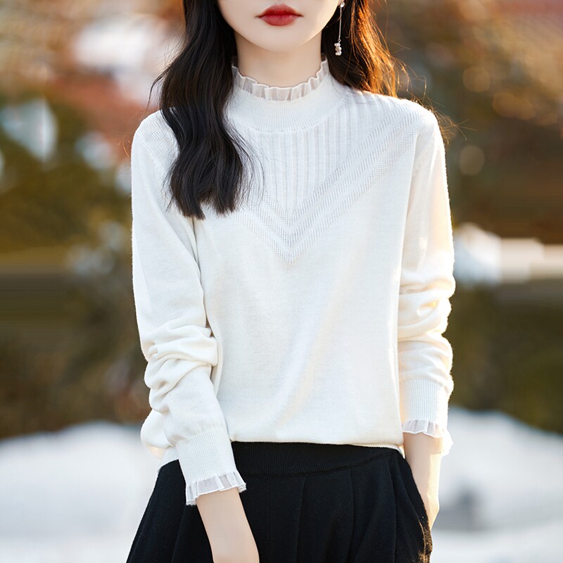 鄂尔多斯市薄款长袖针织衫女2025春季新款桑蚕丝蕾丝边打底羊毛衫