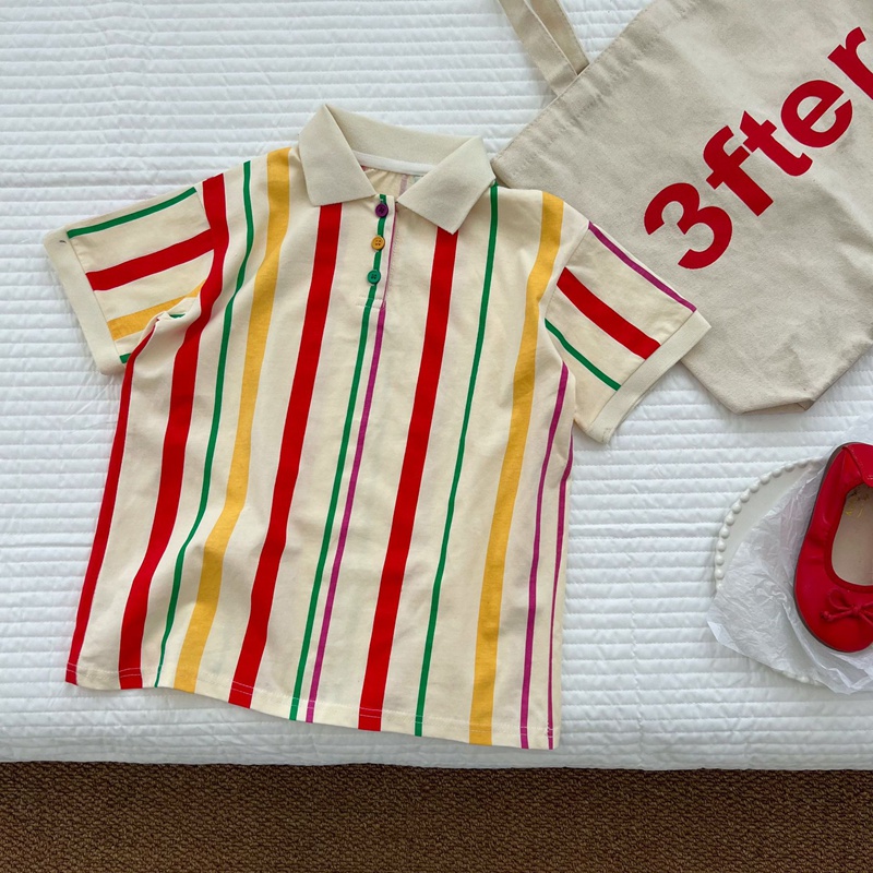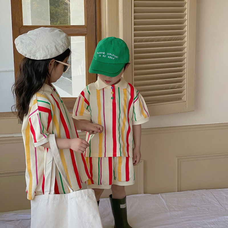 可儿妈儿童彩虹条T恤短袖短裤套装男童女童夏装两件套女孩连衣裙