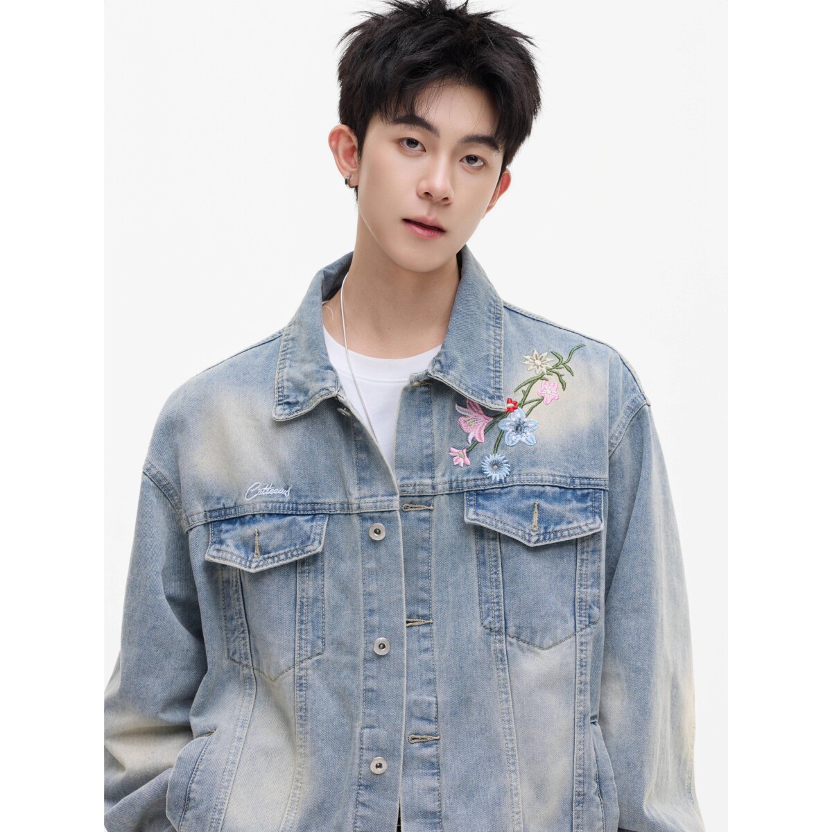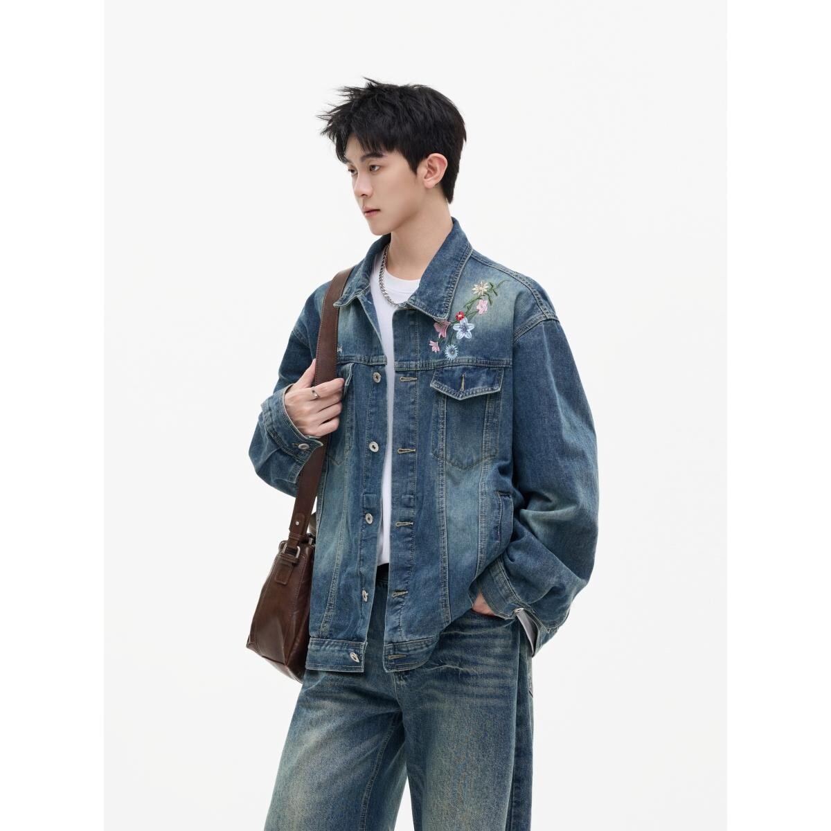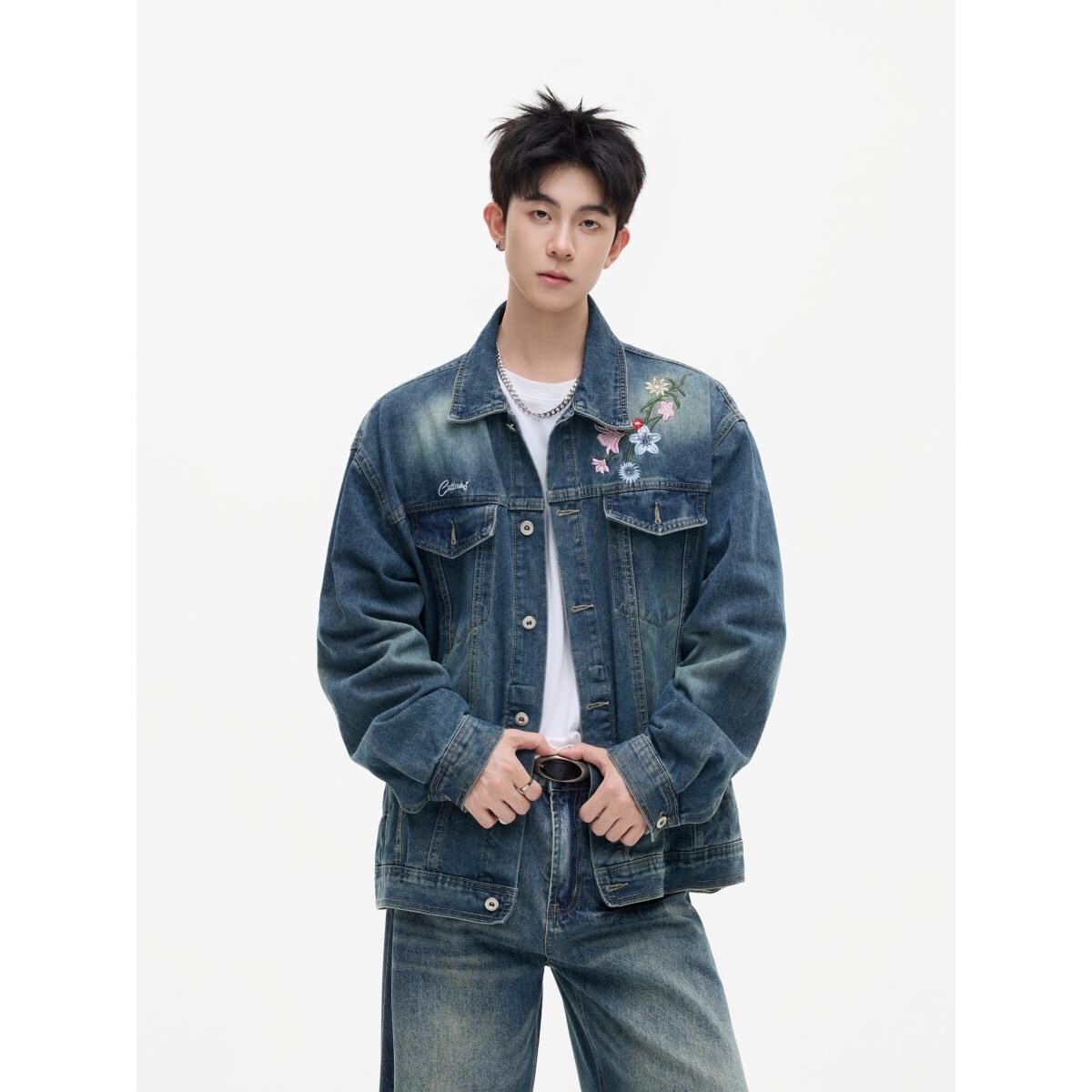 秋美式花卉刺绣水洗廓形宽松翻领牛仔衣夹克情侣外套