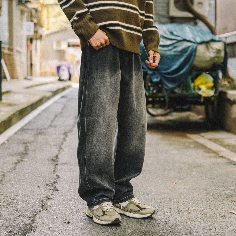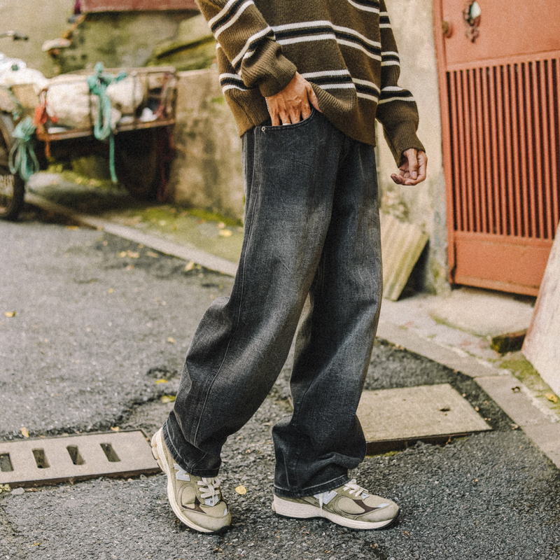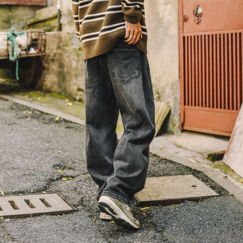兔先森秋冬季美式复古水洗黑色牛仔裤男直筒裤潮牌休闲弯刀休闲裤
