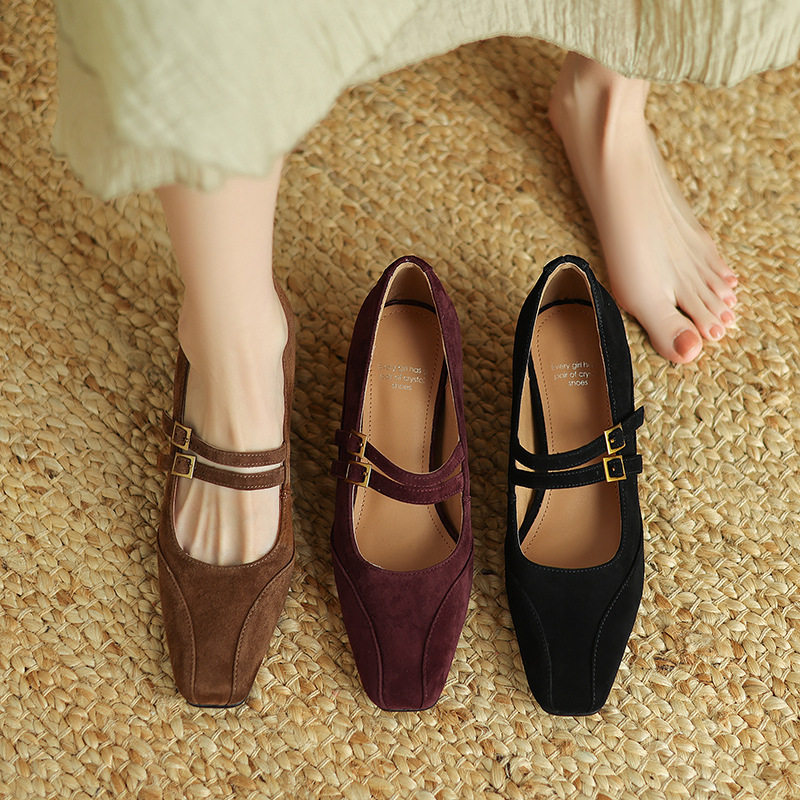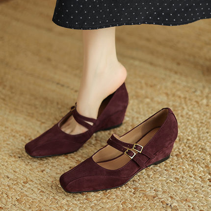 磨砂羊皮玛丽珍鞋2025年秋季浅口单鞋配裙子坡跟英伦风方头小皮鞋