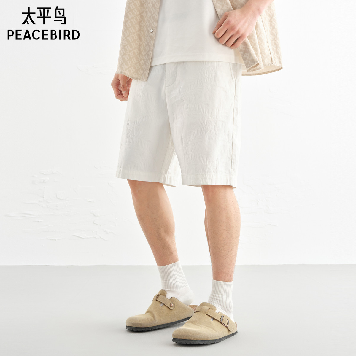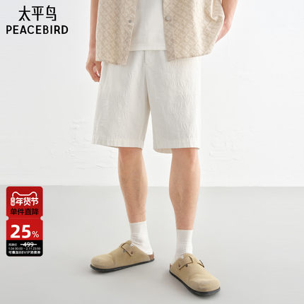 太平鸟男装 休闲牛仔裤男士时尚舒适满版提花牛仔裤白色中短裤潮