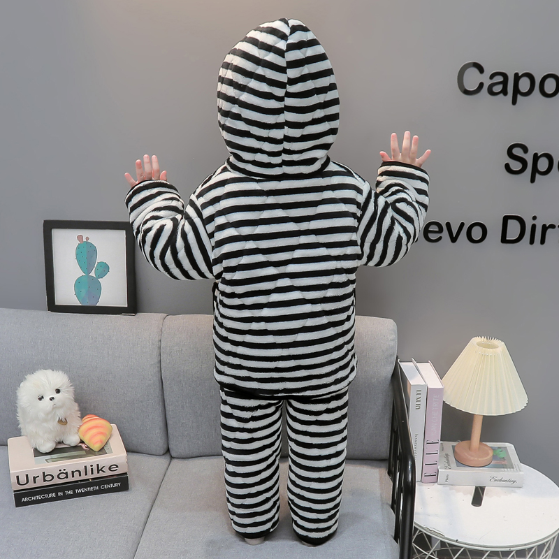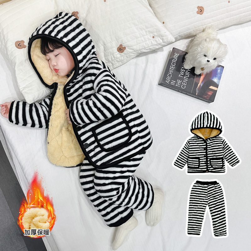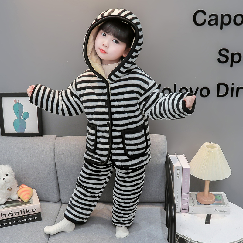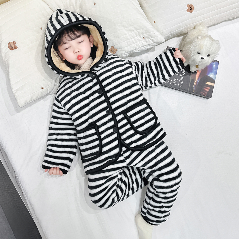 女童睡衣冬季珊瑚绒宝宝加绒加厚家居服开衫棉衣婴儿三层夹棉套装