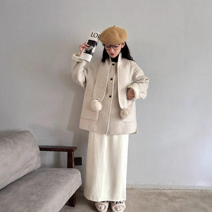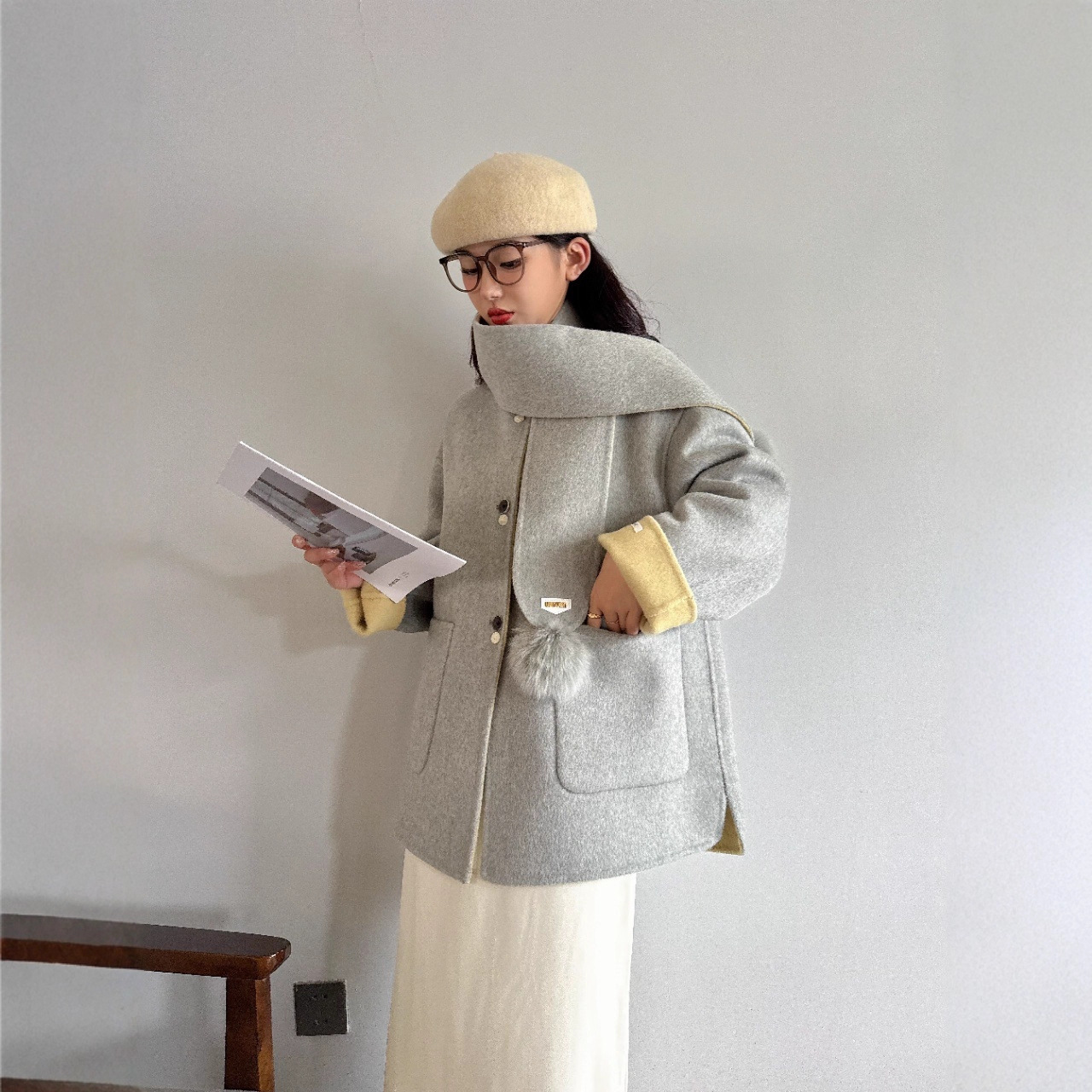 网红爆款2025新款双面羊毛大衣拼色短款韩版宽松围巾毛呢外套羊绒