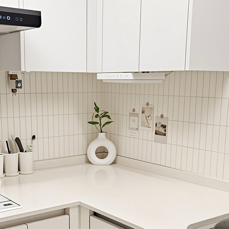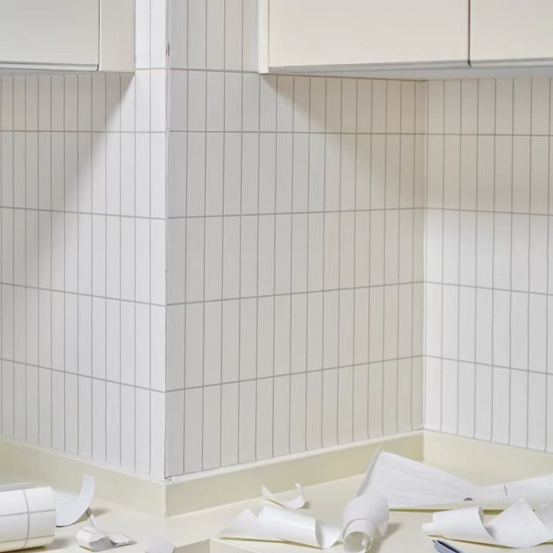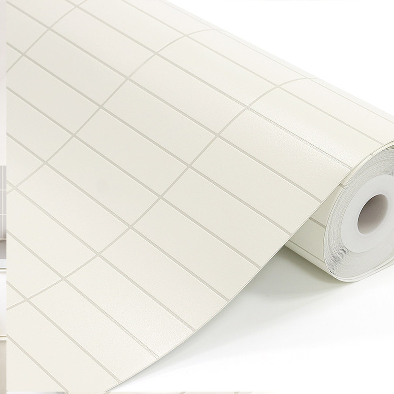 自粘加厚仿瓷砖壁纸防水防油墙贴奶油厨房改造翻新奶白条纹砖墙纸