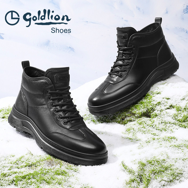 金利来男鞋棉靴防滑冬新黑色真皮羊皮毛一体加厚保暖户外休闲棉靴