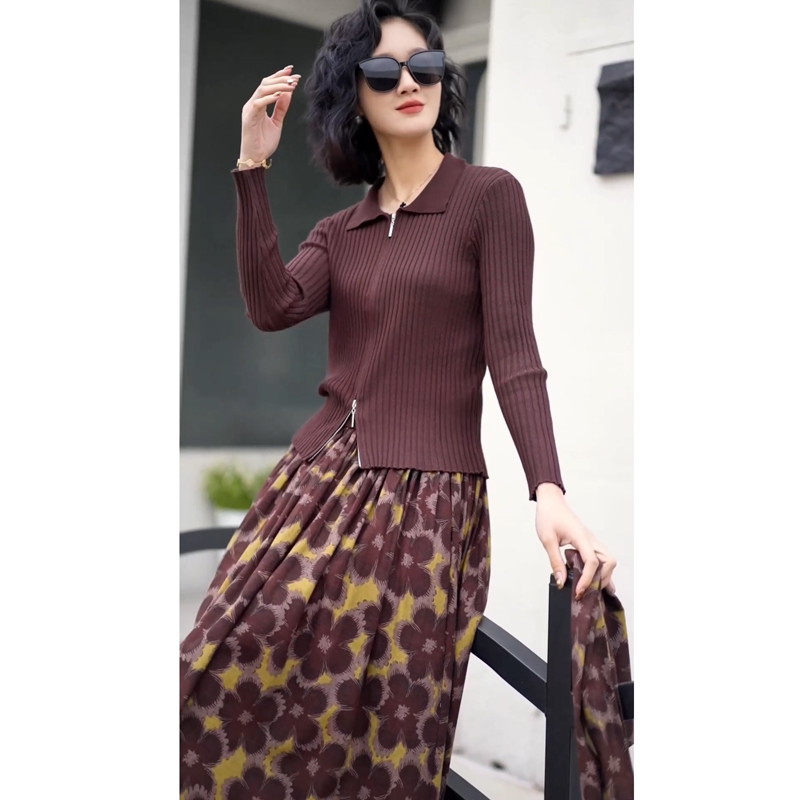 复古印花套装裙妈妈装2025春新款小众修身针织上衣修身a字半身裙