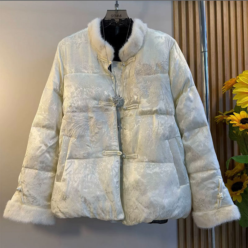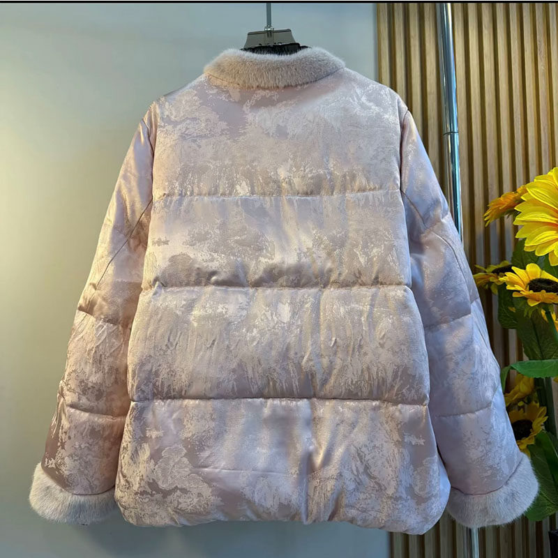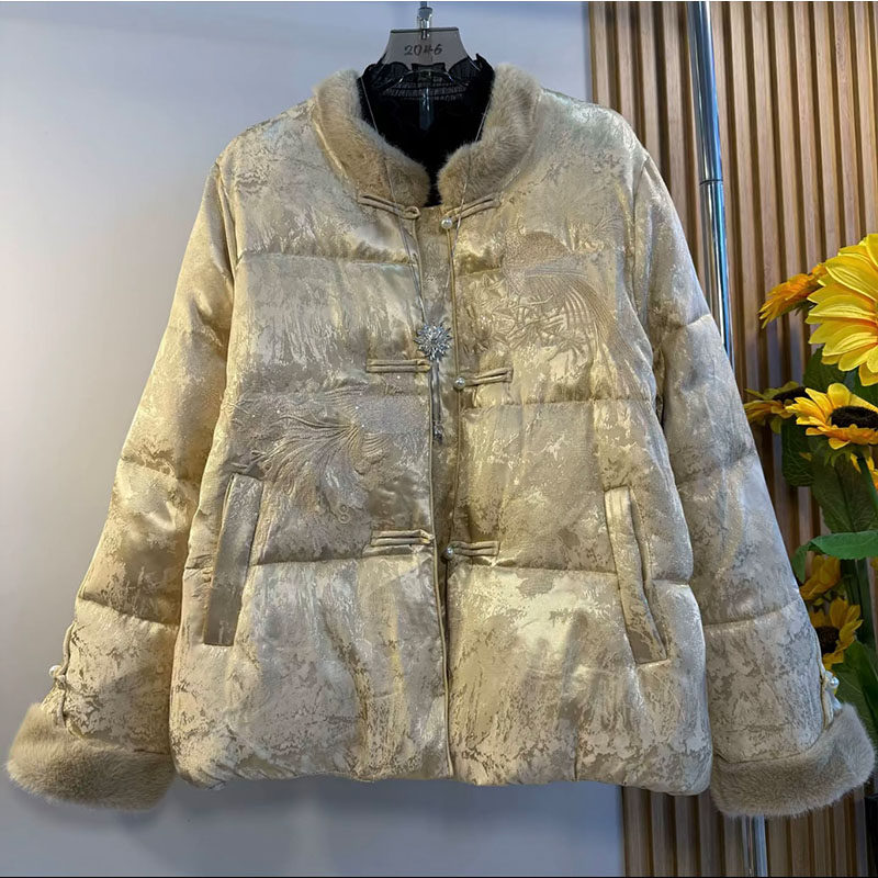 新中式大码女装2025冬季款轻奢国风毛领盘扣提花棉服保暖厚款外套