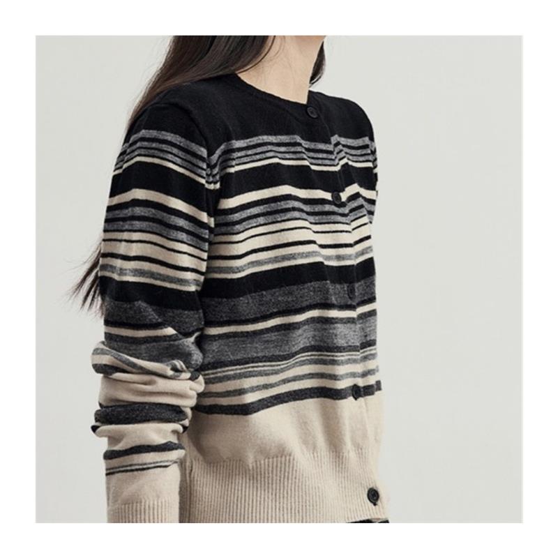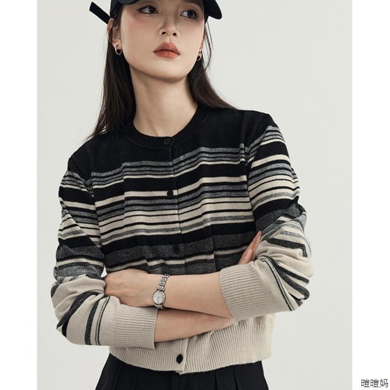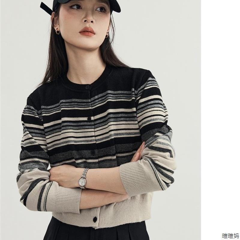 条纹羊绒针织开衫短外套女早秋季新款圆领显瘦短款上衣小个子毛衣