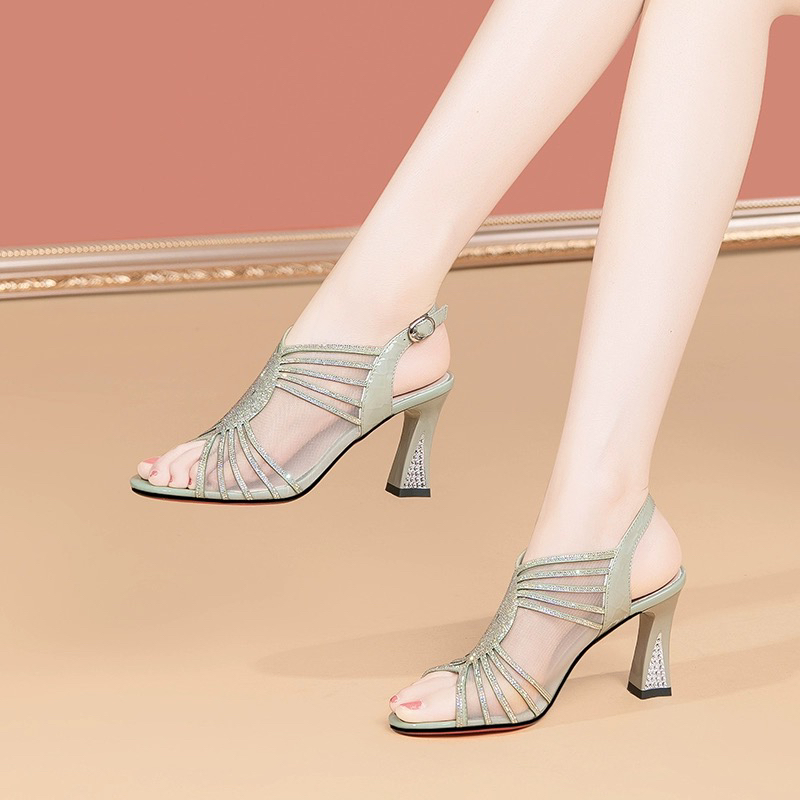 真皮水钻高跟凉鞋女2025夏新款粗跟网纱鱼嘴女鞋时尚镂空凉鞋女鞋