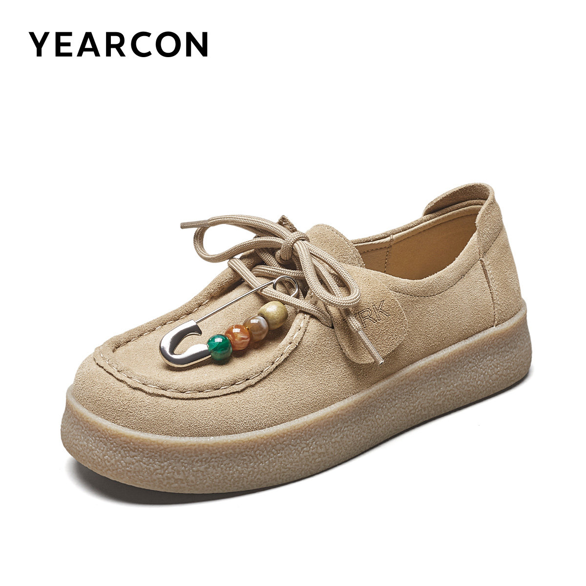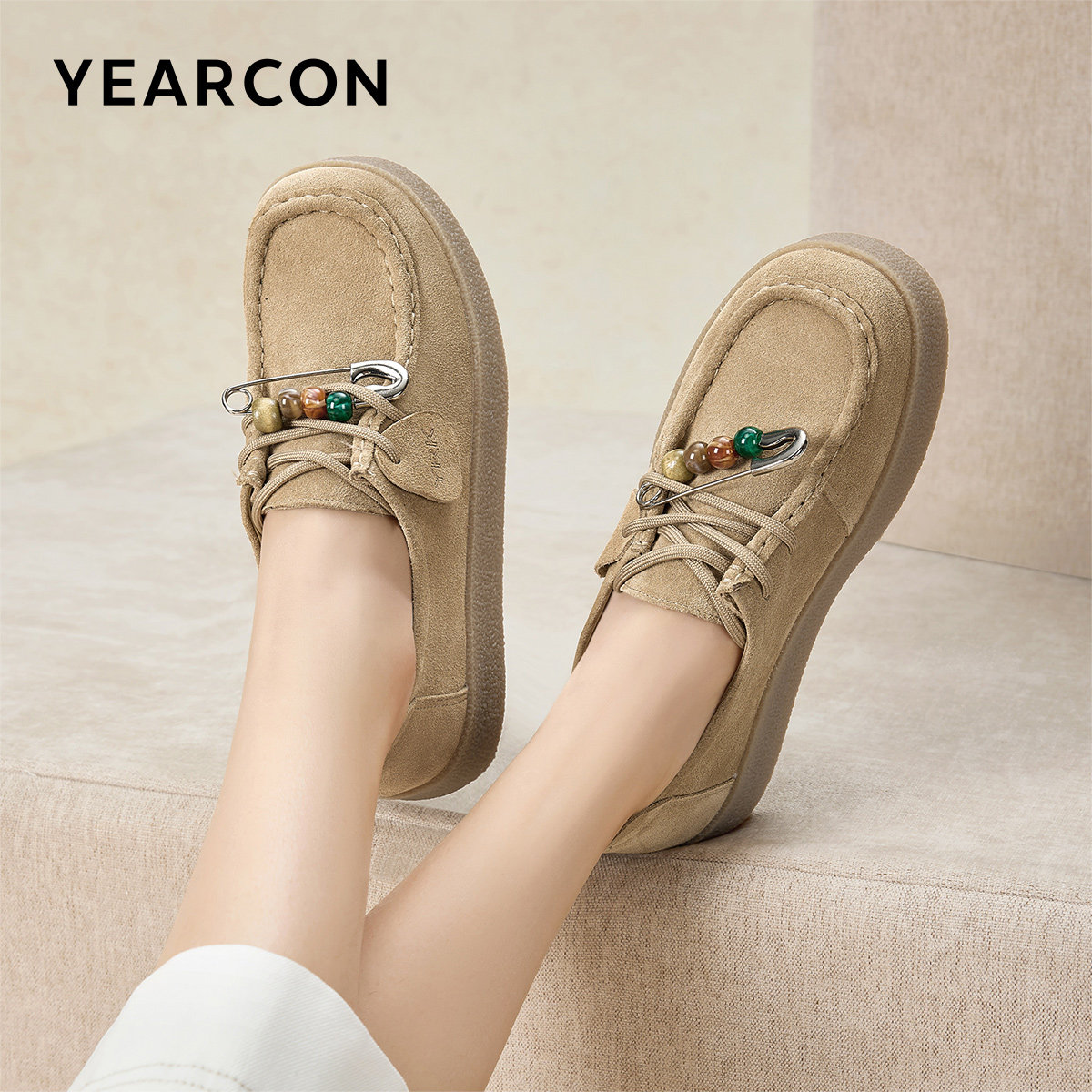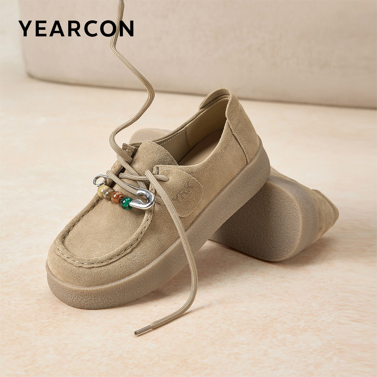 意尔康真皮厚底勃肯鞋女2026春秋款外穿软底系带串珠不累脚乐福鞋