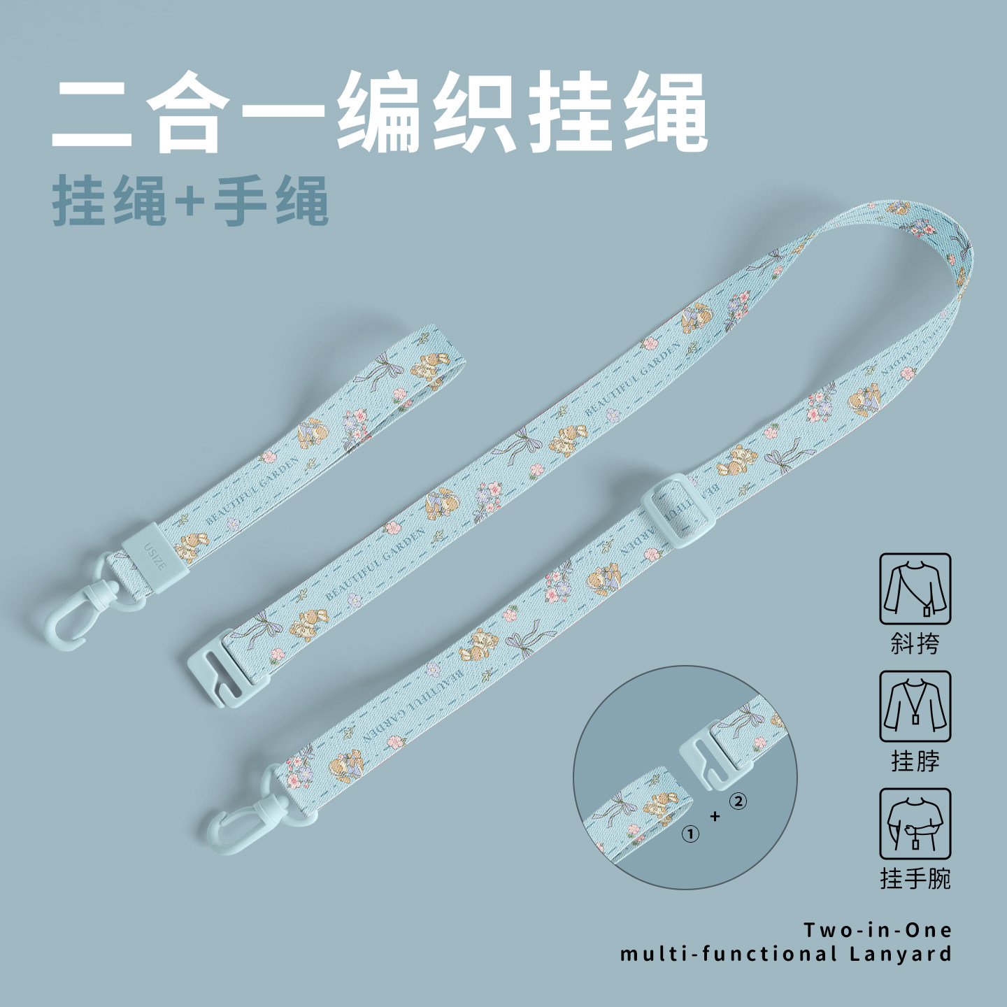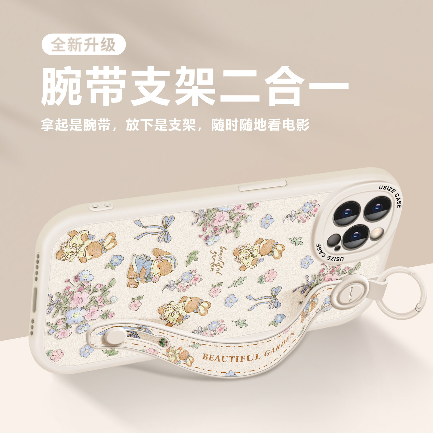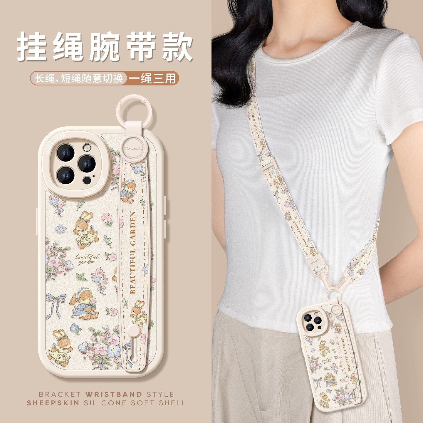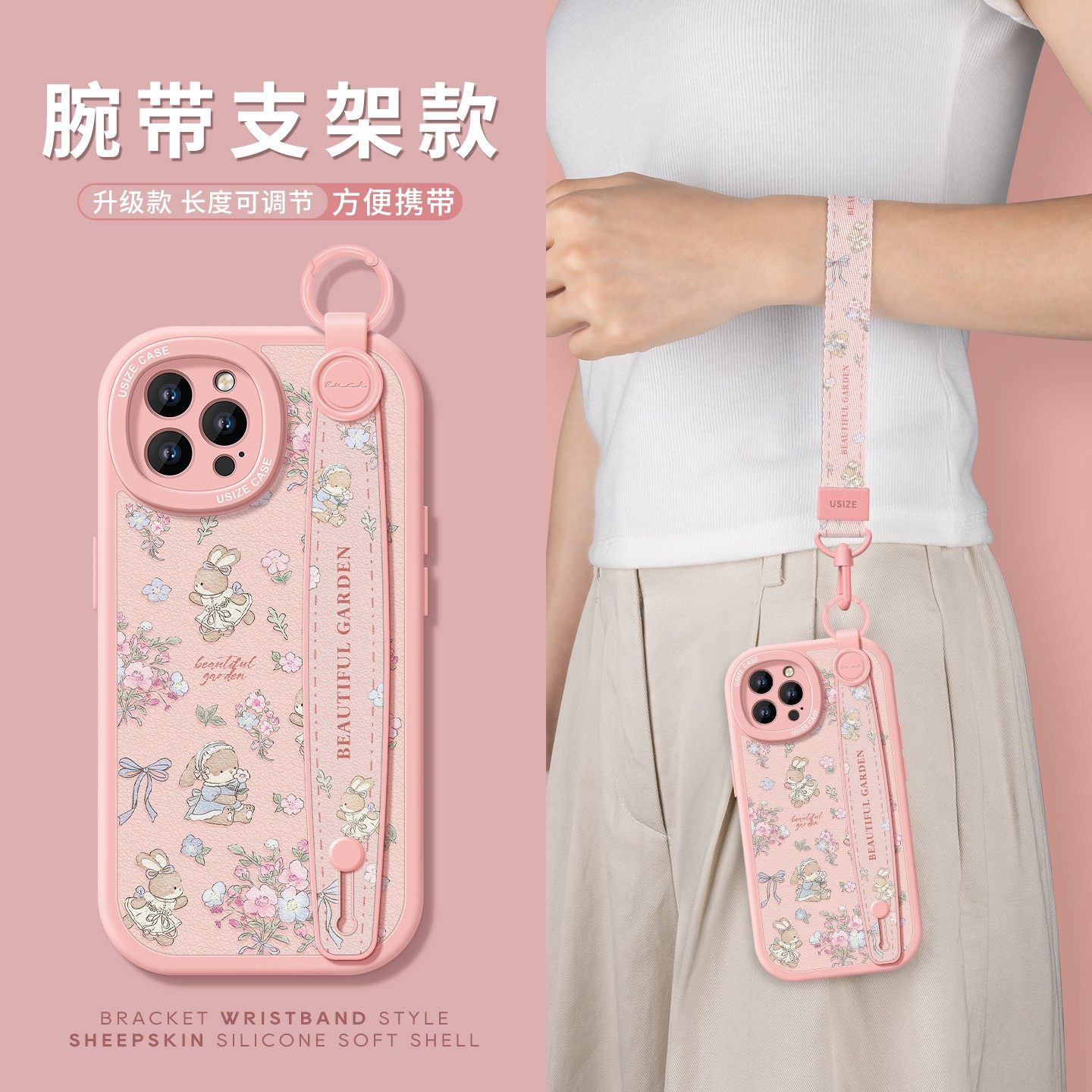 碎花兔子适用苹果16Promax手机壳14pro新款女iPhone13全包17手绳防摔iPhone15腕带挂绳7plus斜跨6s挂脖xr背带