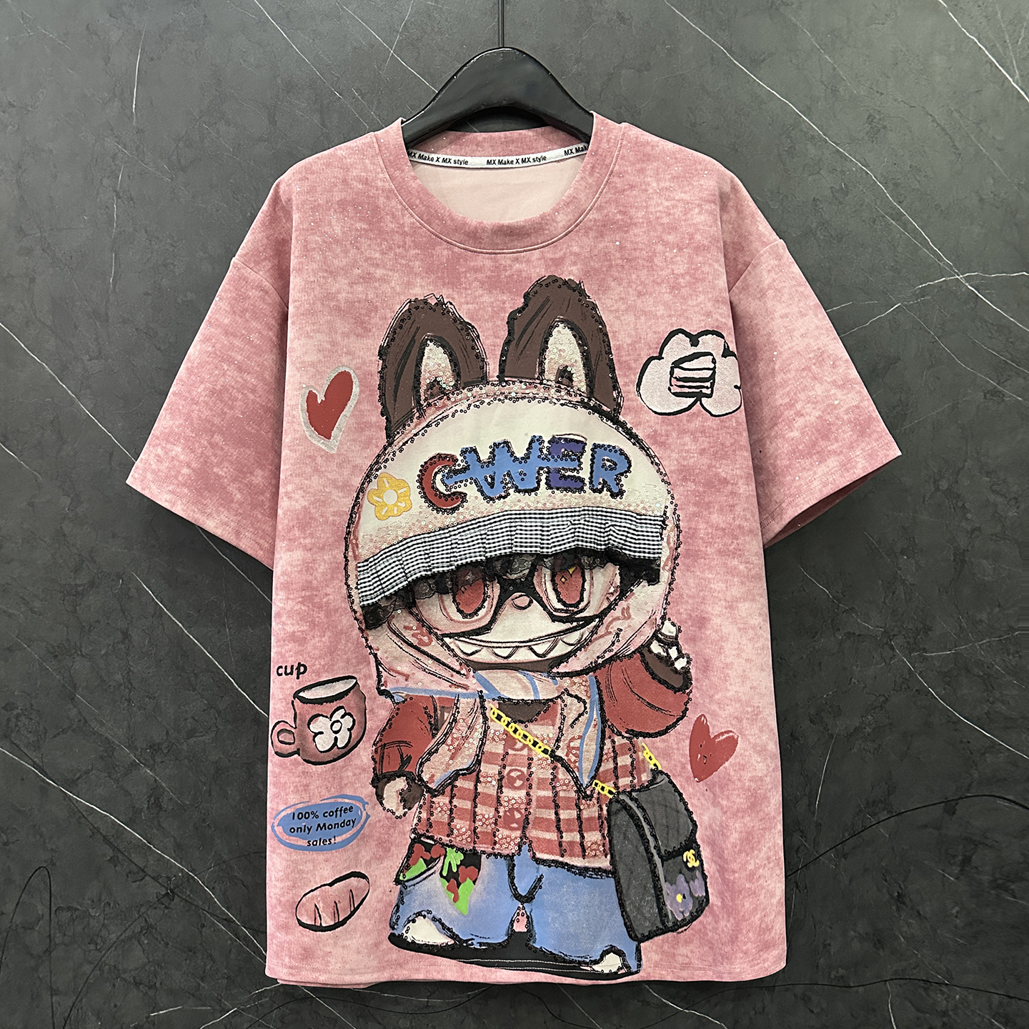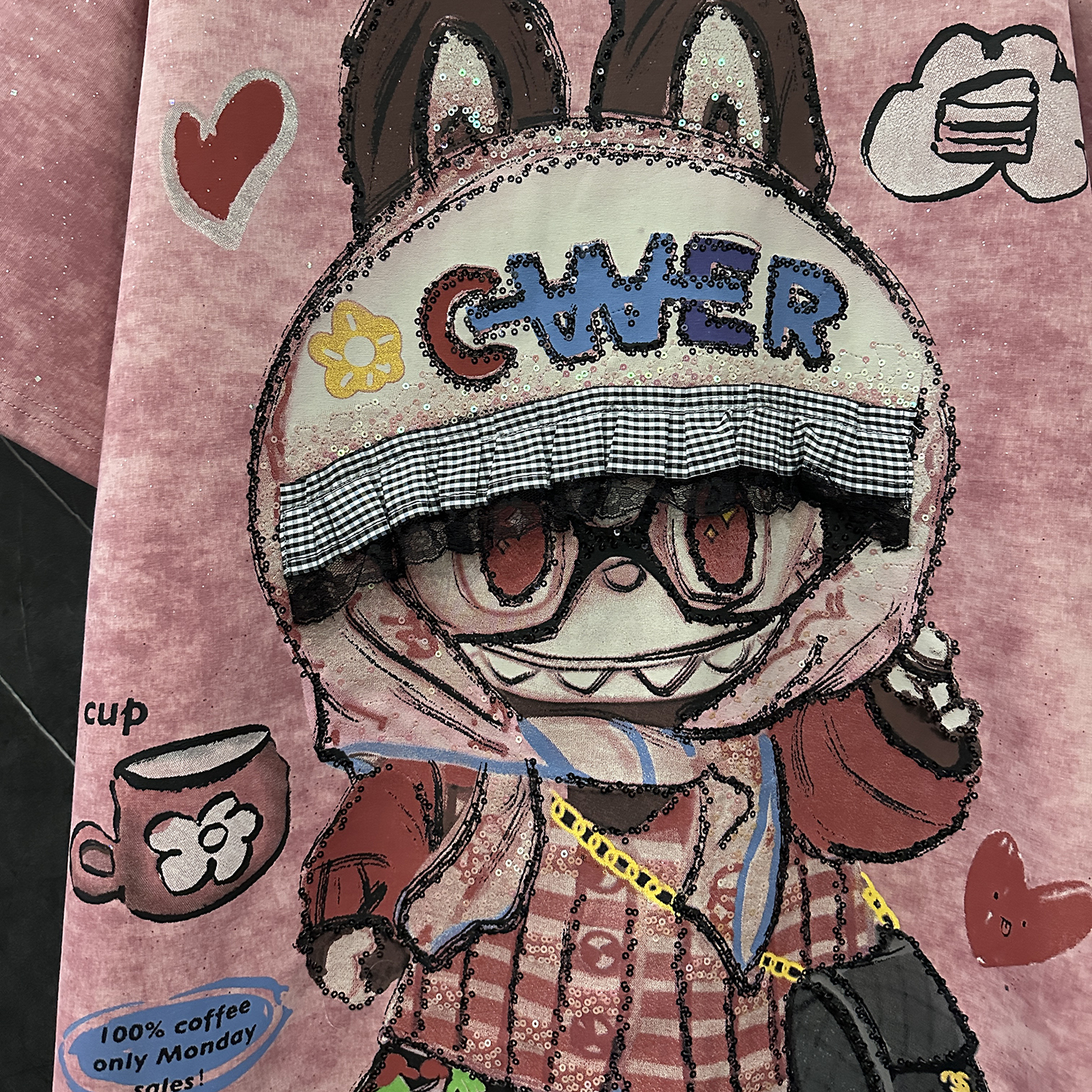 2025早秋新款卡通拉布布亮片印花短袖T恤女宽松休闲中长款上衣潮