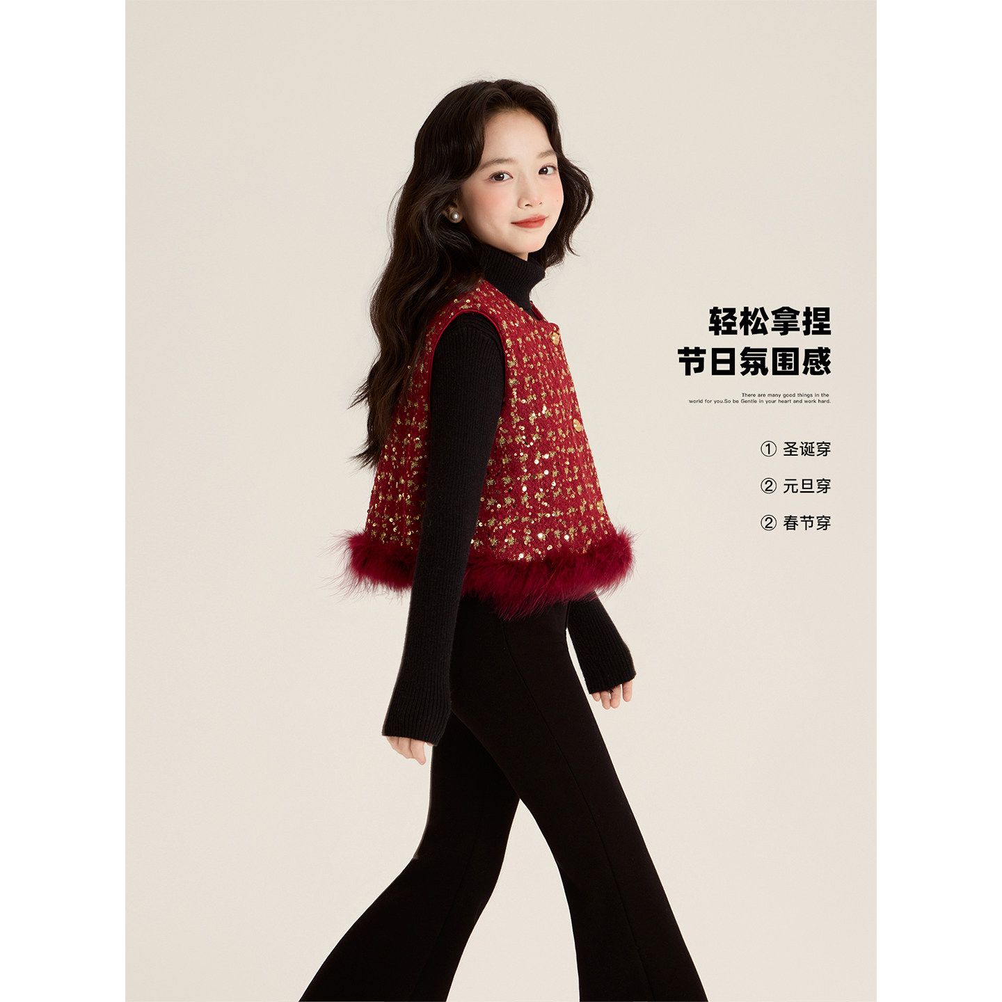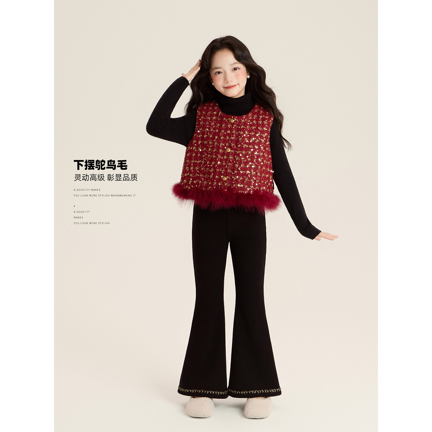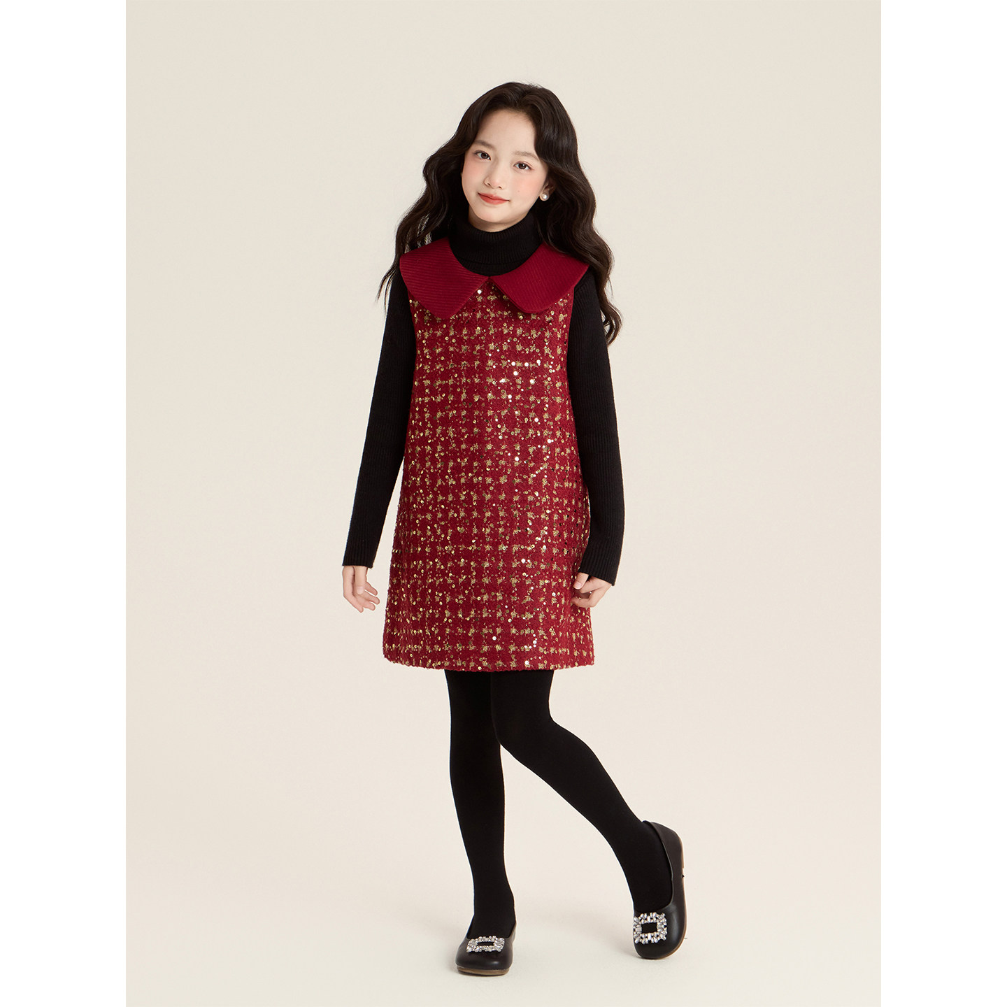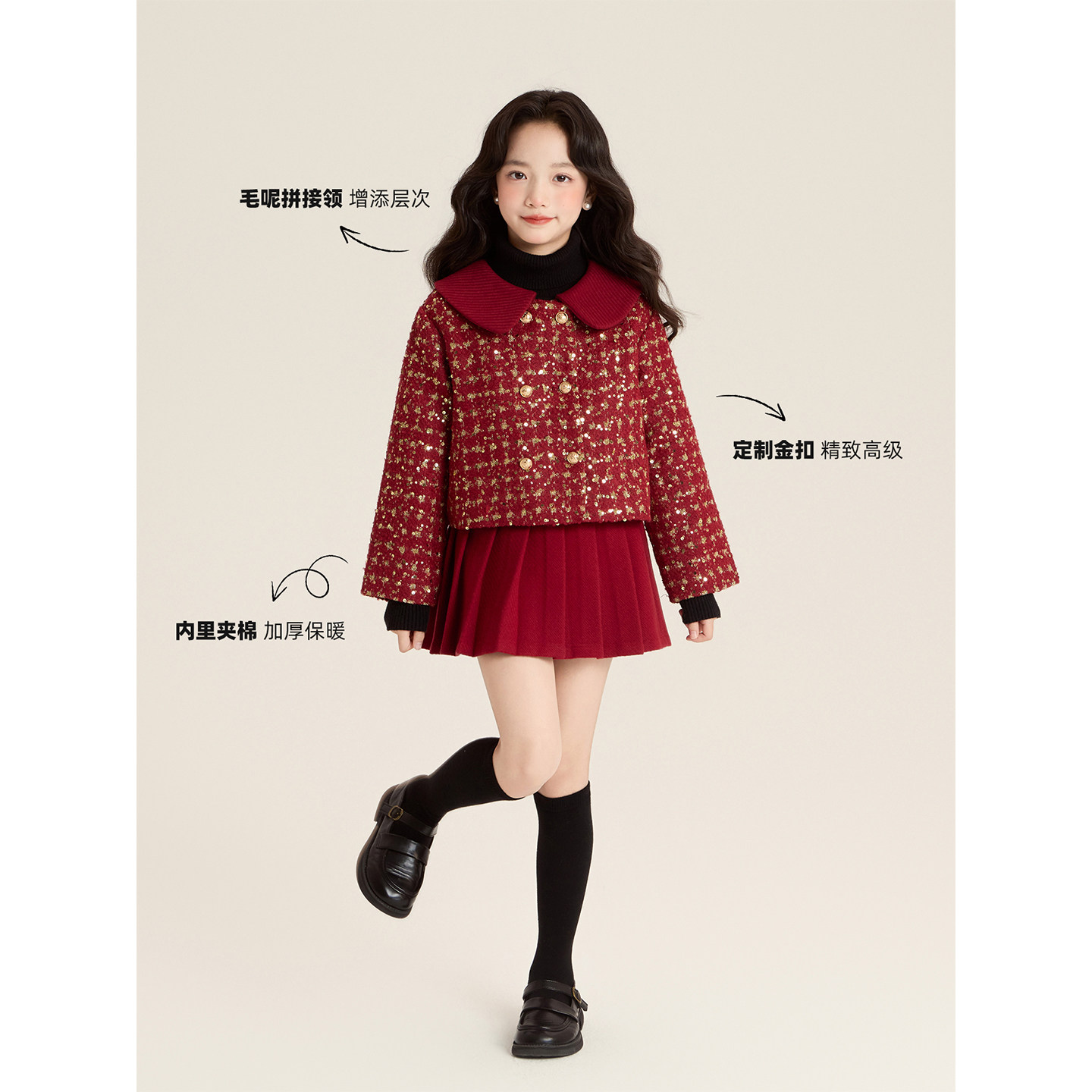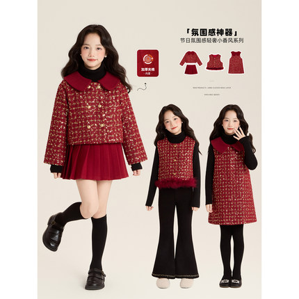 Amybaby女童套装冬季2025新款夹棉红色呢子小香风外套连衣裙马甲
