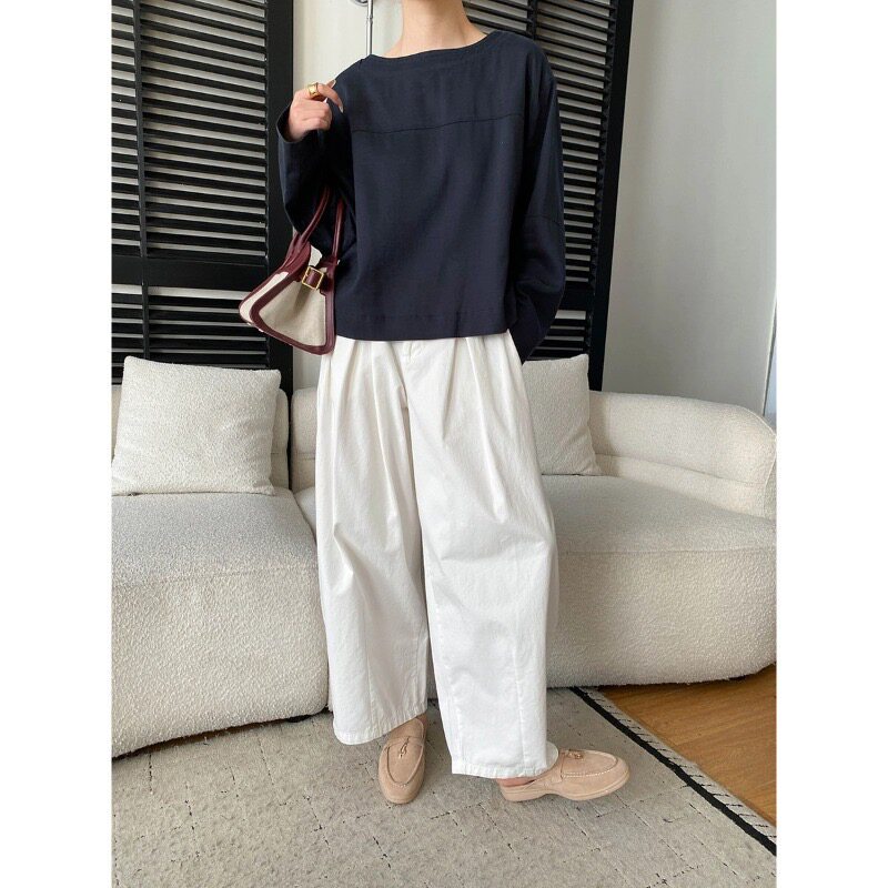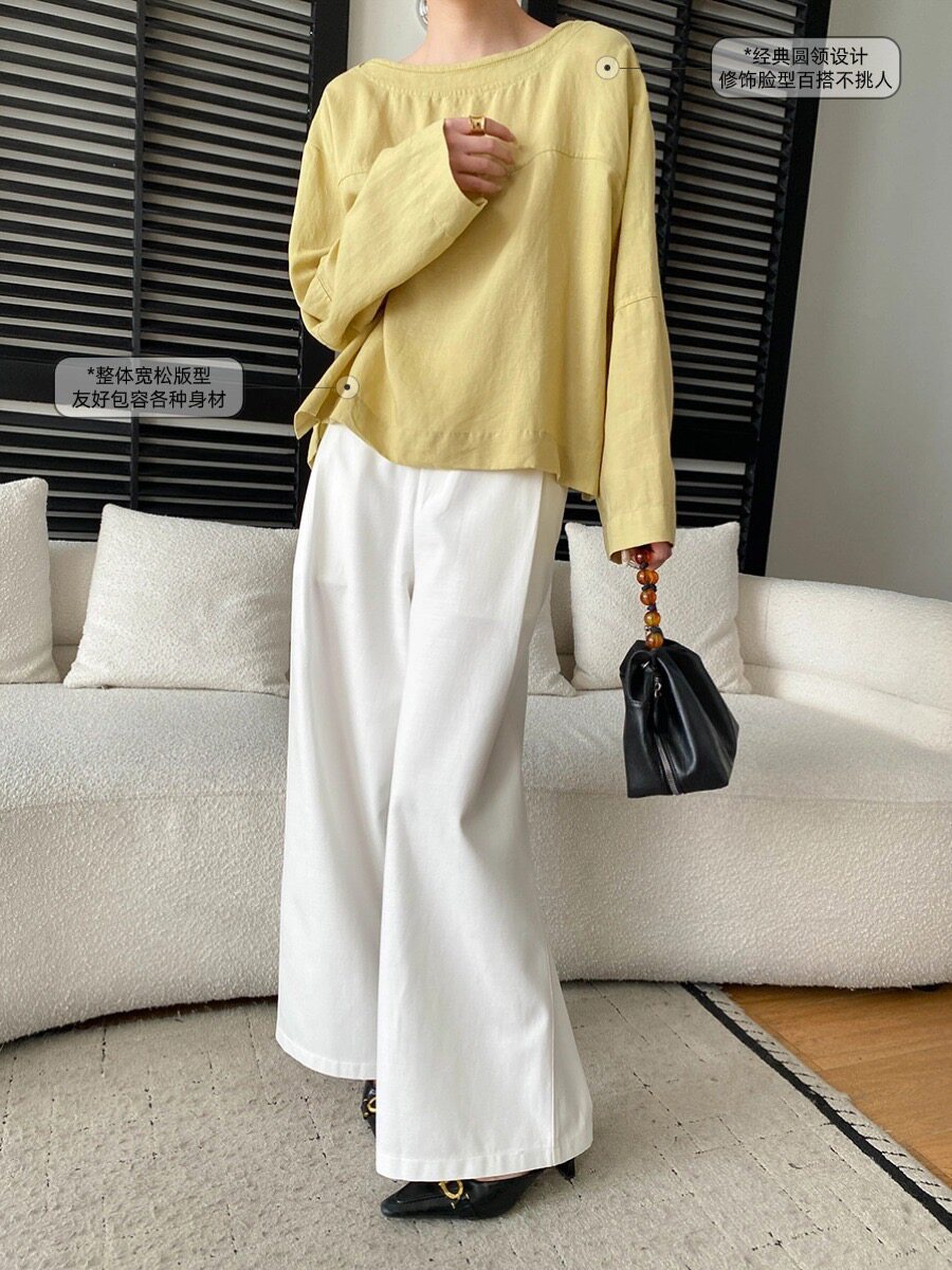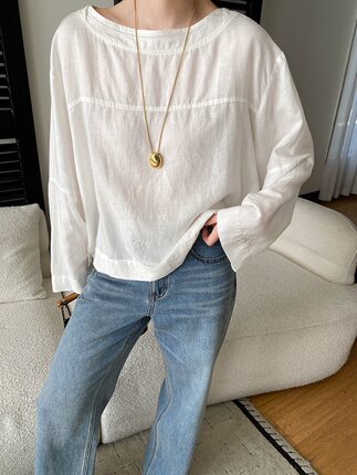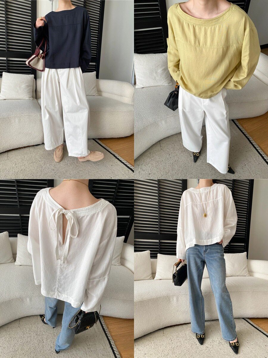 u m 由米早春新款后背镂空系带设计感圆领套头宽松长袖衬衫
