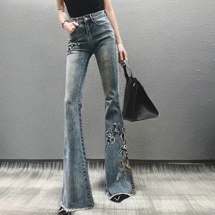 欧洲站欧货2025春季新款百搭刺绣花朵喇叭牛仔裤高腰显瘦微喇叭裤