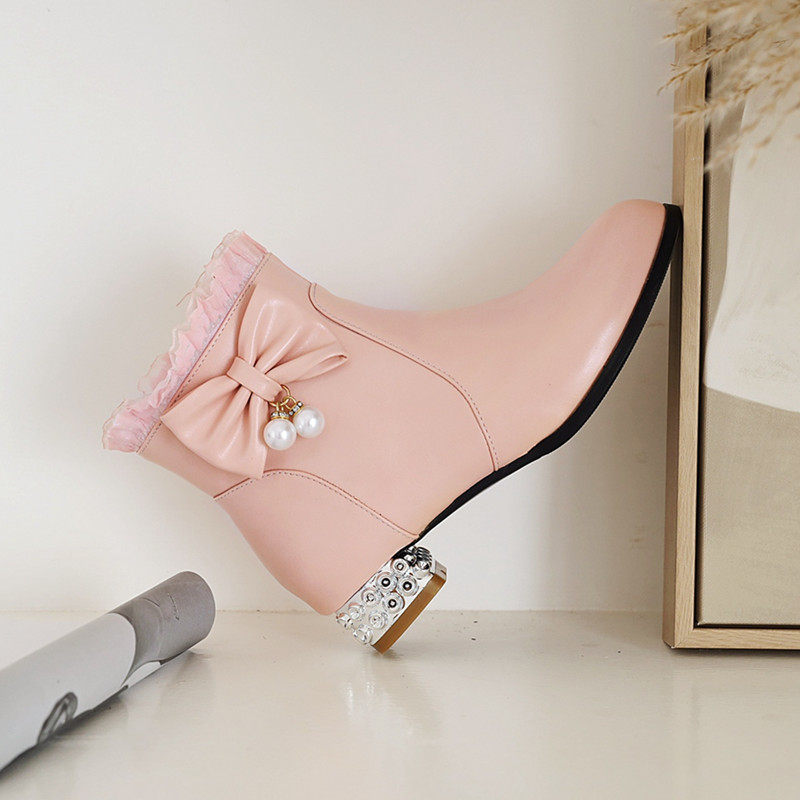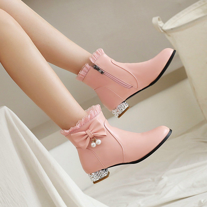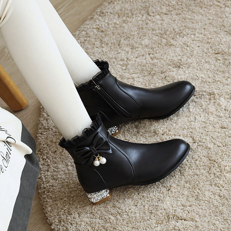 甜美蕾丝蝴蝶结低跟女鞋时尚学院风圆头短靴子秋冬大童小码马丁靴