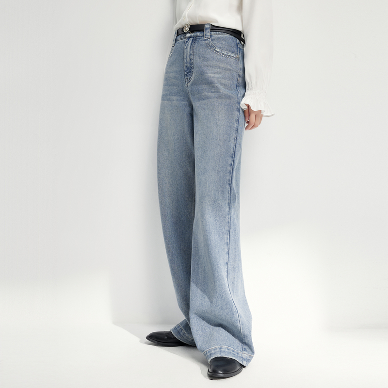 秋水伊人断码清仓时尚牛仔裤女装秋季新款简约高腰直筒阔腿长裤子