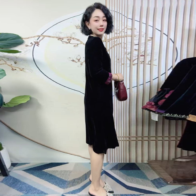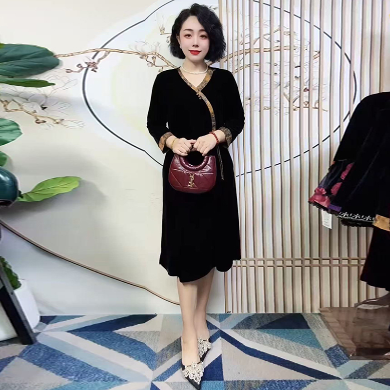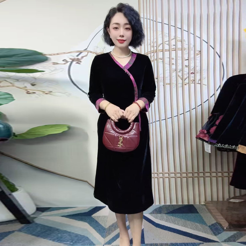 2025秋季新款复古盘扣丝绒长裙奶奶时尚气质显瘦新中式大码连衣裙