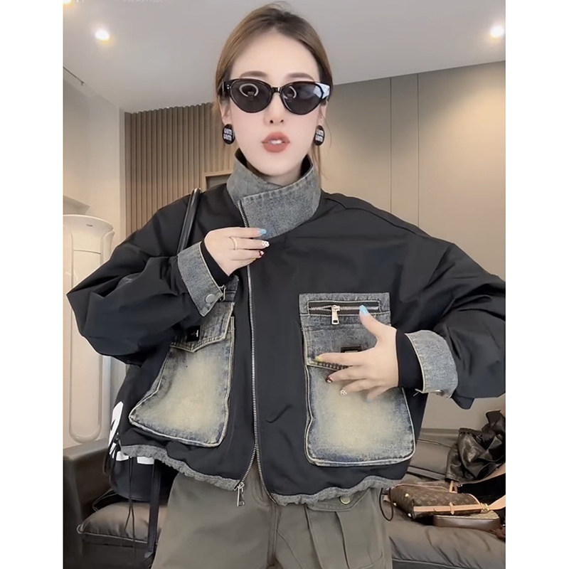 2026春秋时尚短款宽松立领牛仔拼接外套百搭休闲夹克上衣女棒球服