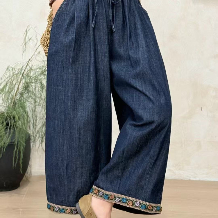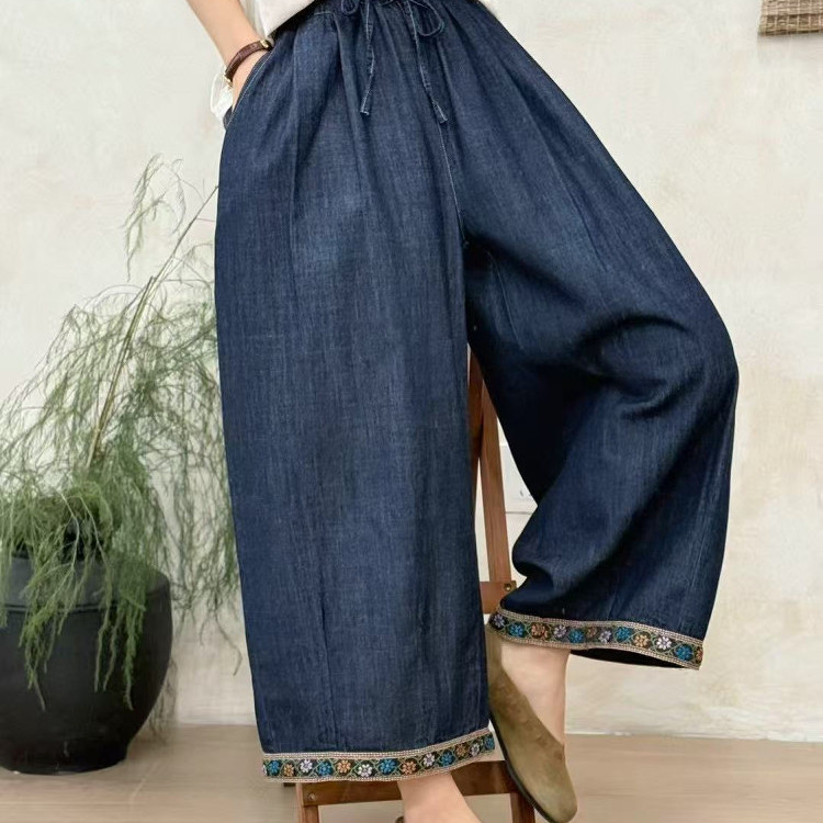 花概念夏季薄款复古文艺刺绣花边直筒牛仔裤裙宽松显瘦阔腿九分裤