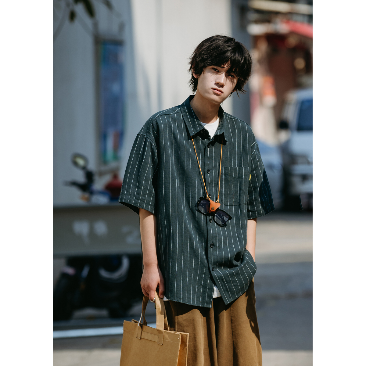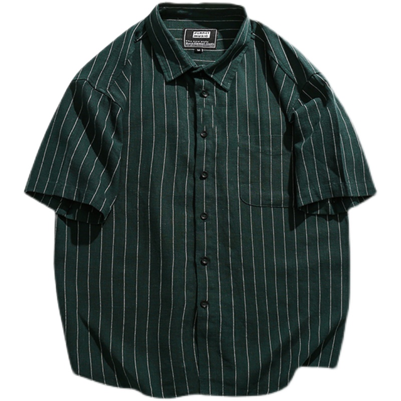 南鹤2022夏季日系翻领条纹宽松衬衫男潮休闲棉麻复古情侣短袖衬衣
