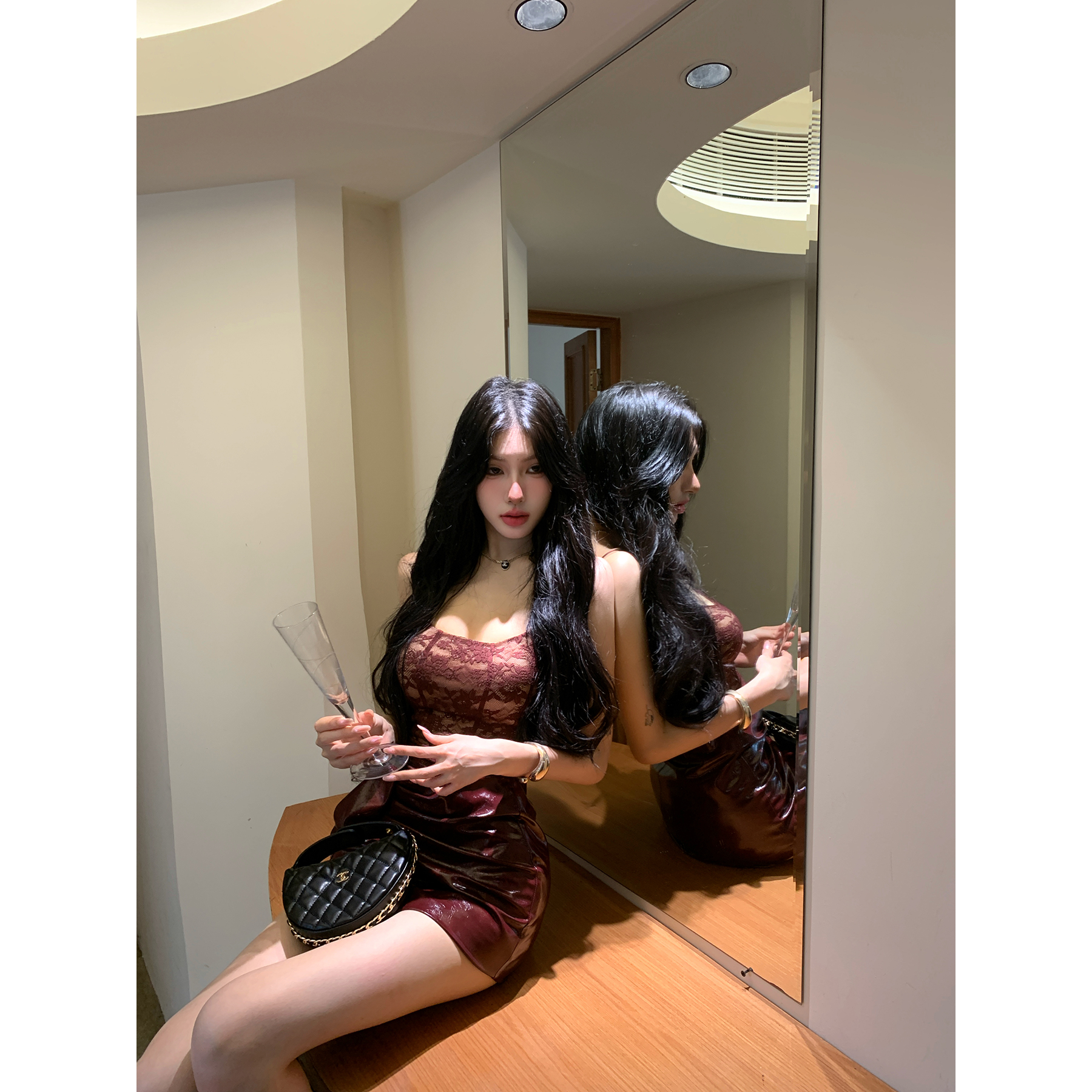 牛了牛了 辣妹穿搭套装女2025早秋蕾丝吊带上衣皮裙半身裙两件套