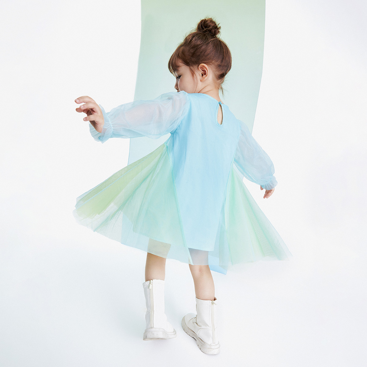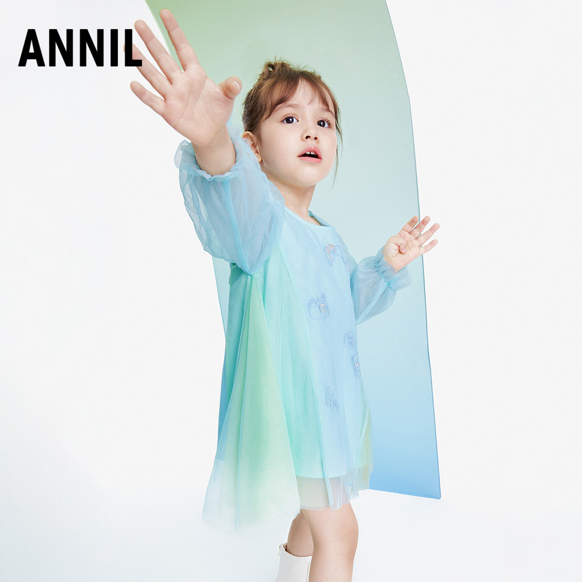 安奈儿女童装长袖圆领连衣裙春秋季款幼小童网纱宝宝直筒裙