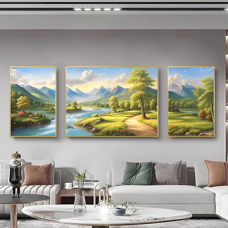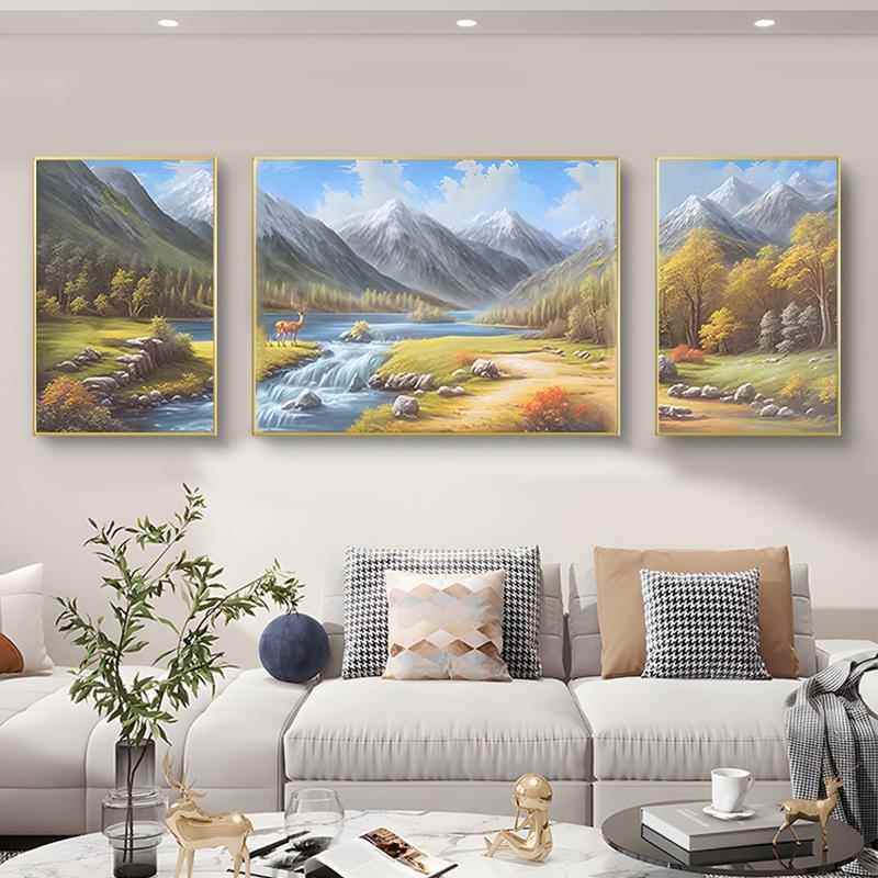 日照金山客厅沙发背景墙三联画装饰画2025新款聚宝盆山水风景油画