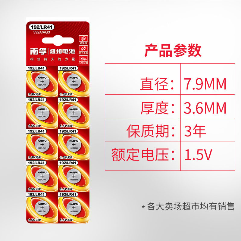 南孚LR41纽扣电池AG3体温计额温枪192 392 L736发光耳勺电子扣式测电笔钮扣电子手表欧姆龙儿童玩具圆形十粒