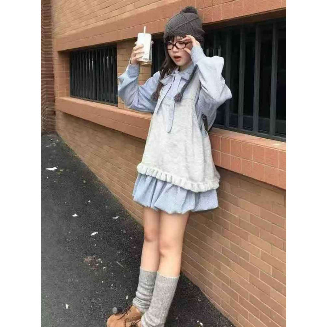 韩系复古格子蝴蝶结裙衬衫花苞裙女背心甜美套装秋季好看连衣裙