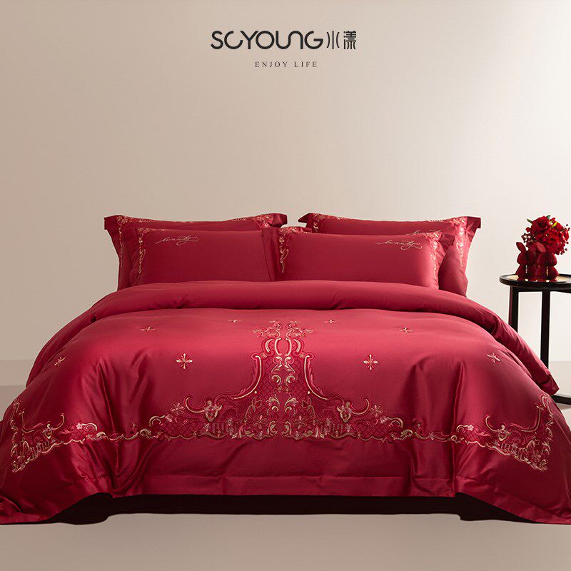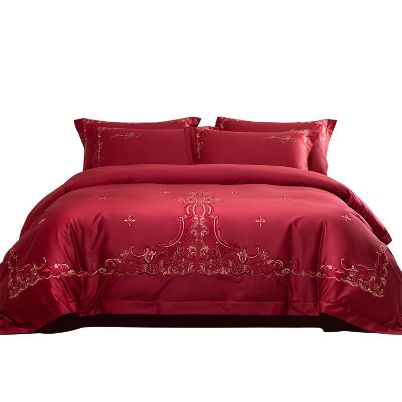 欧式100eS长绒棉结婚四件套红色纯棉全棉床单刺绣被套婚庆床上用