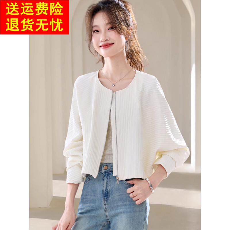 2025秋季新款黑色蝙蝠袖设计净版短外套宽松小个子坑条拉链上衣女
