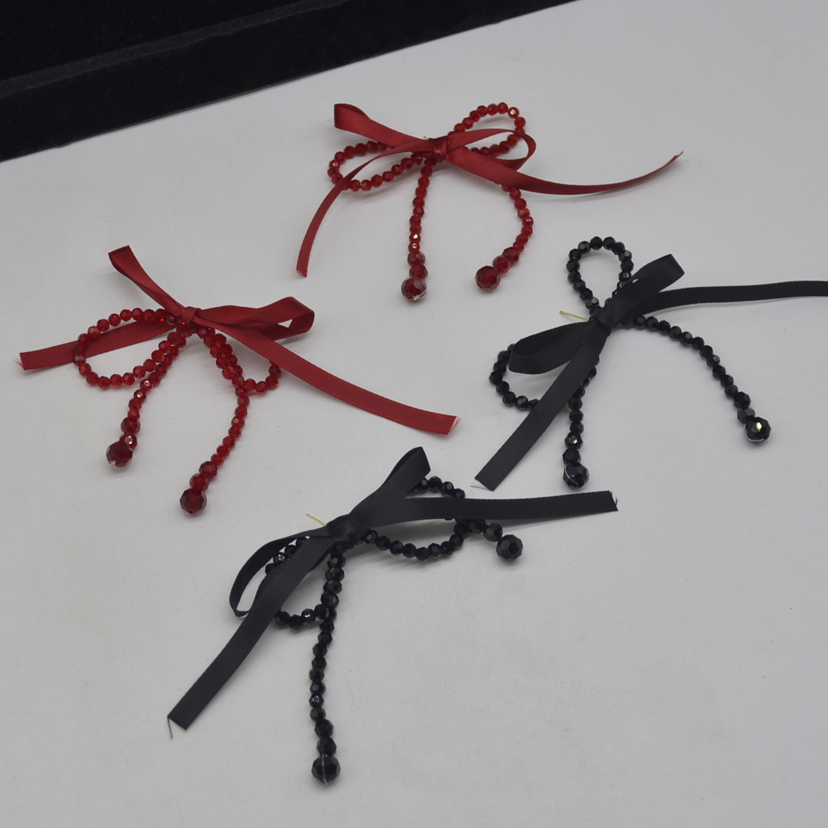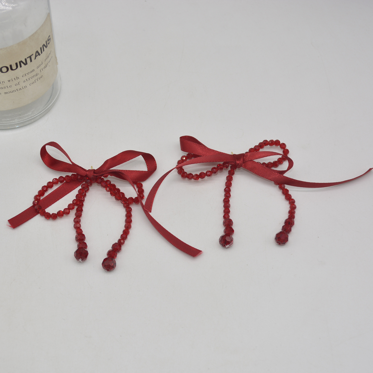 红色丝带蝴蝶结耳环女串珠水晶流苏长款气质舞会晚宴夸张银针耳饰