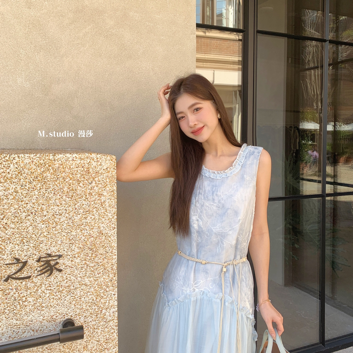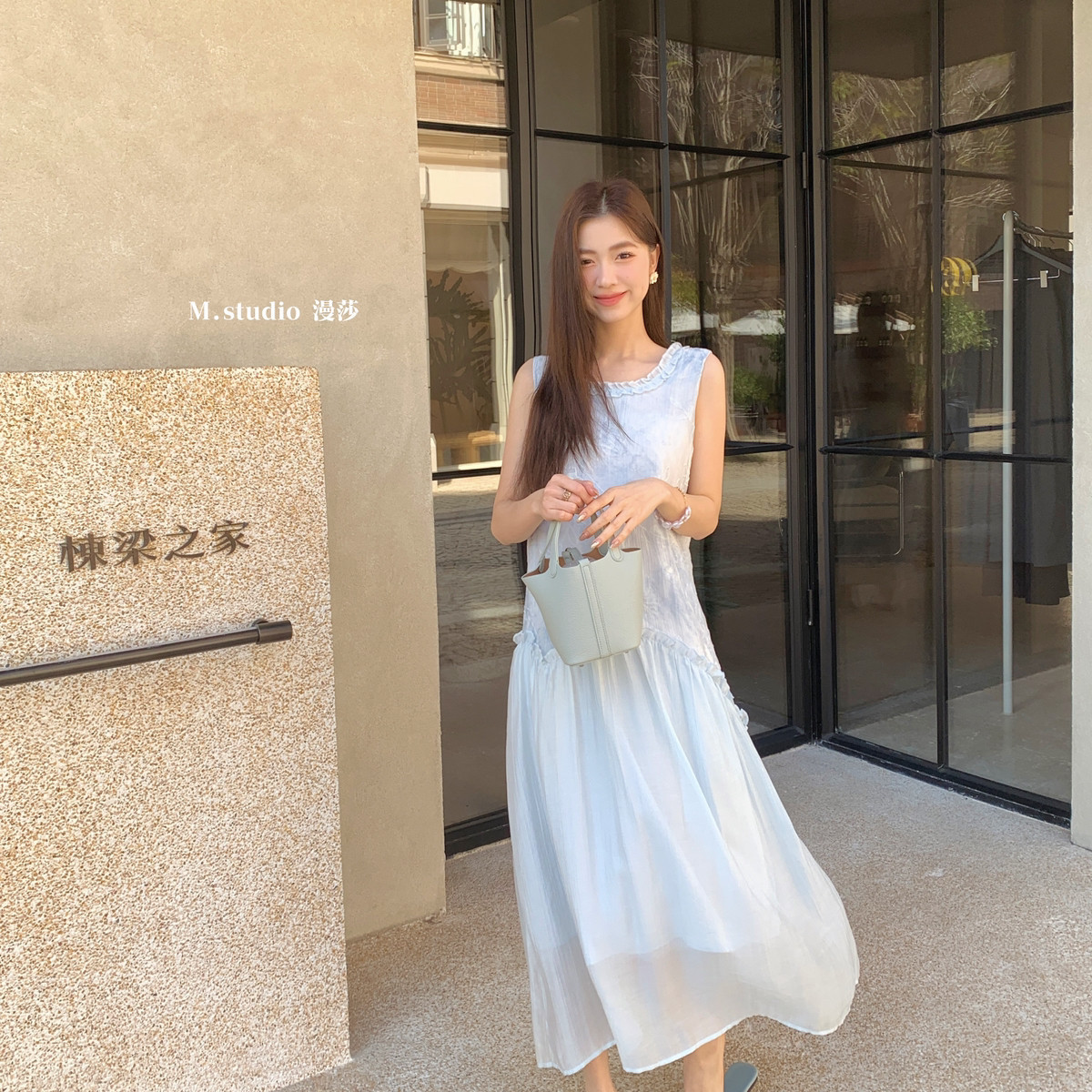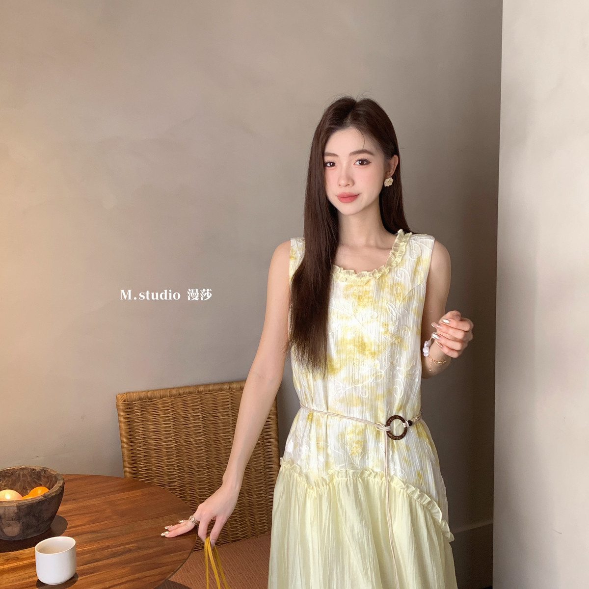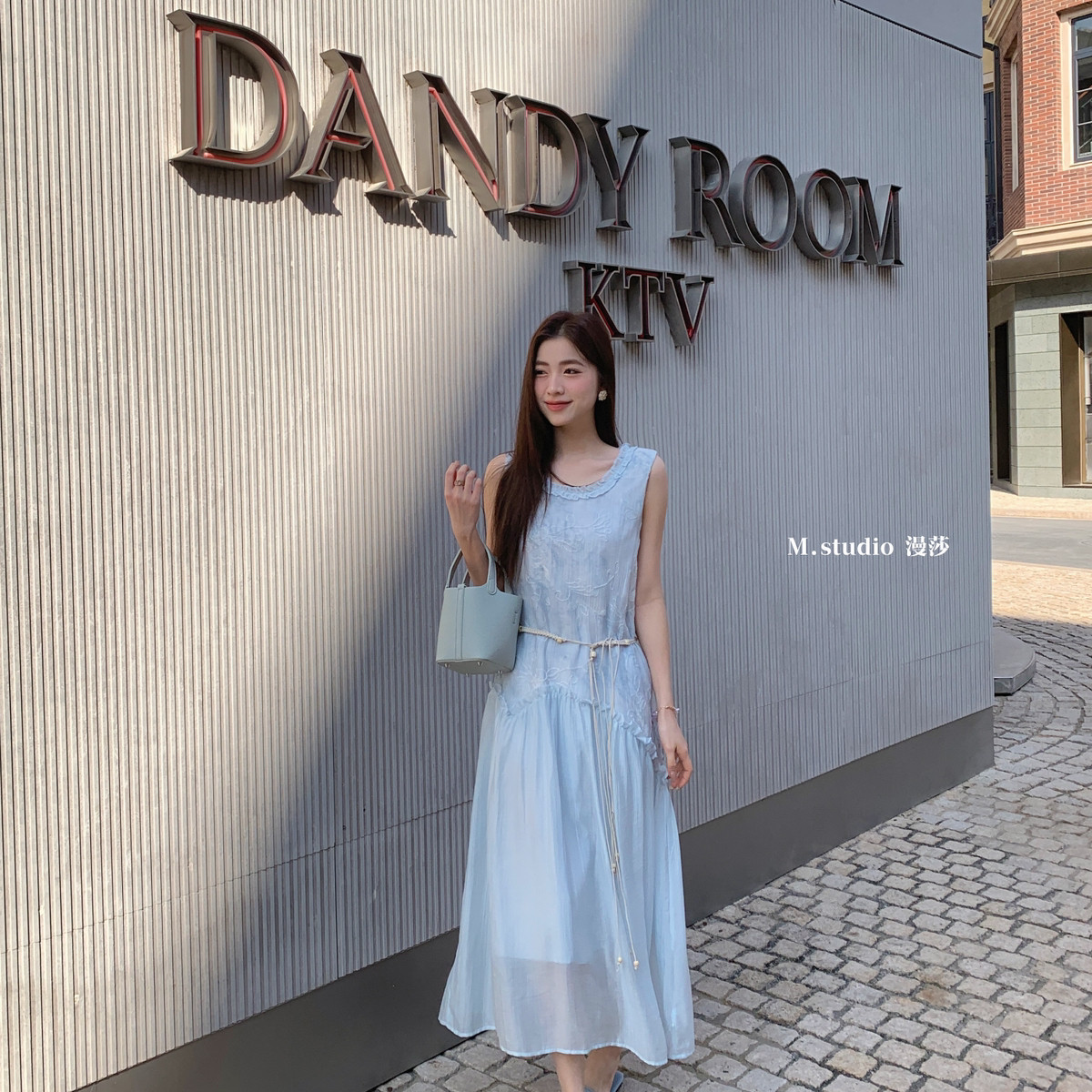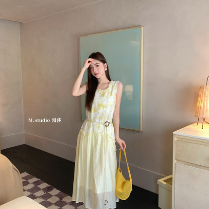 米米设计新款晕染提花撞色拼接木耳花边背心长裙连衣裙c6676
