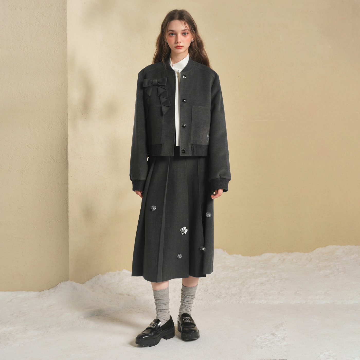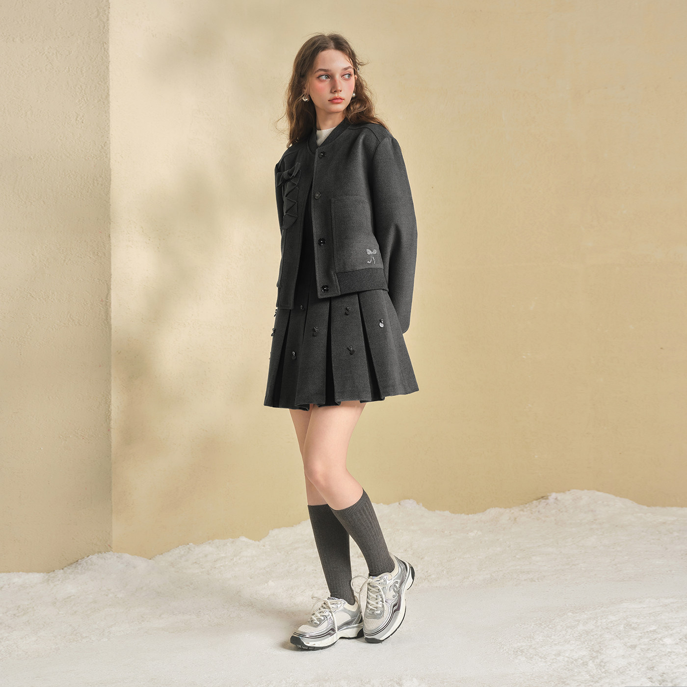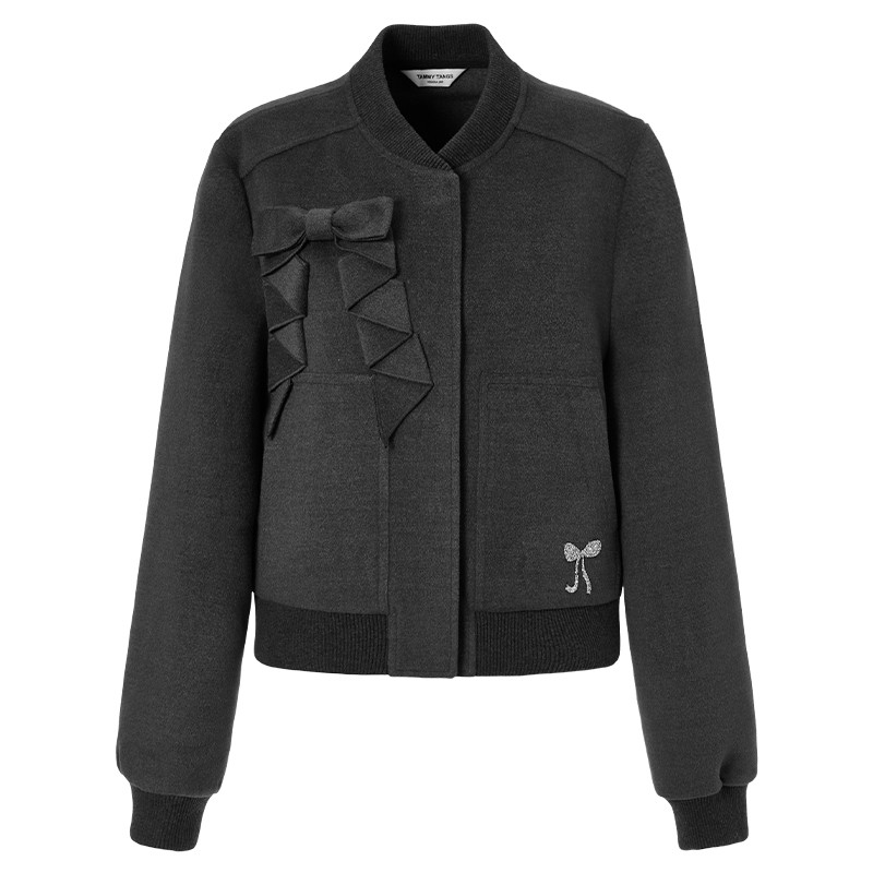 商场同款糖力 运动少女棒球服夹克 灰色宽松毛呢短外套女秋冬季