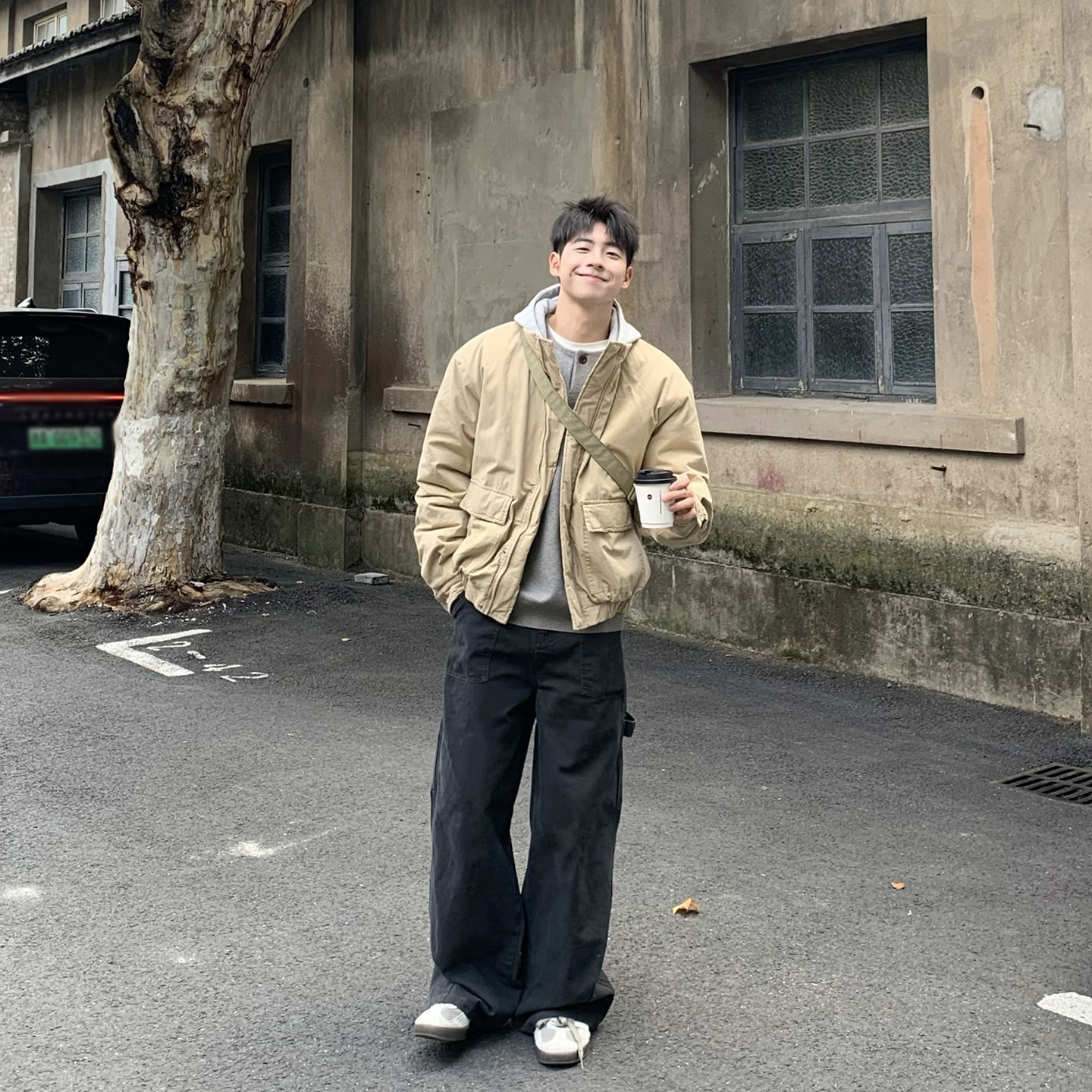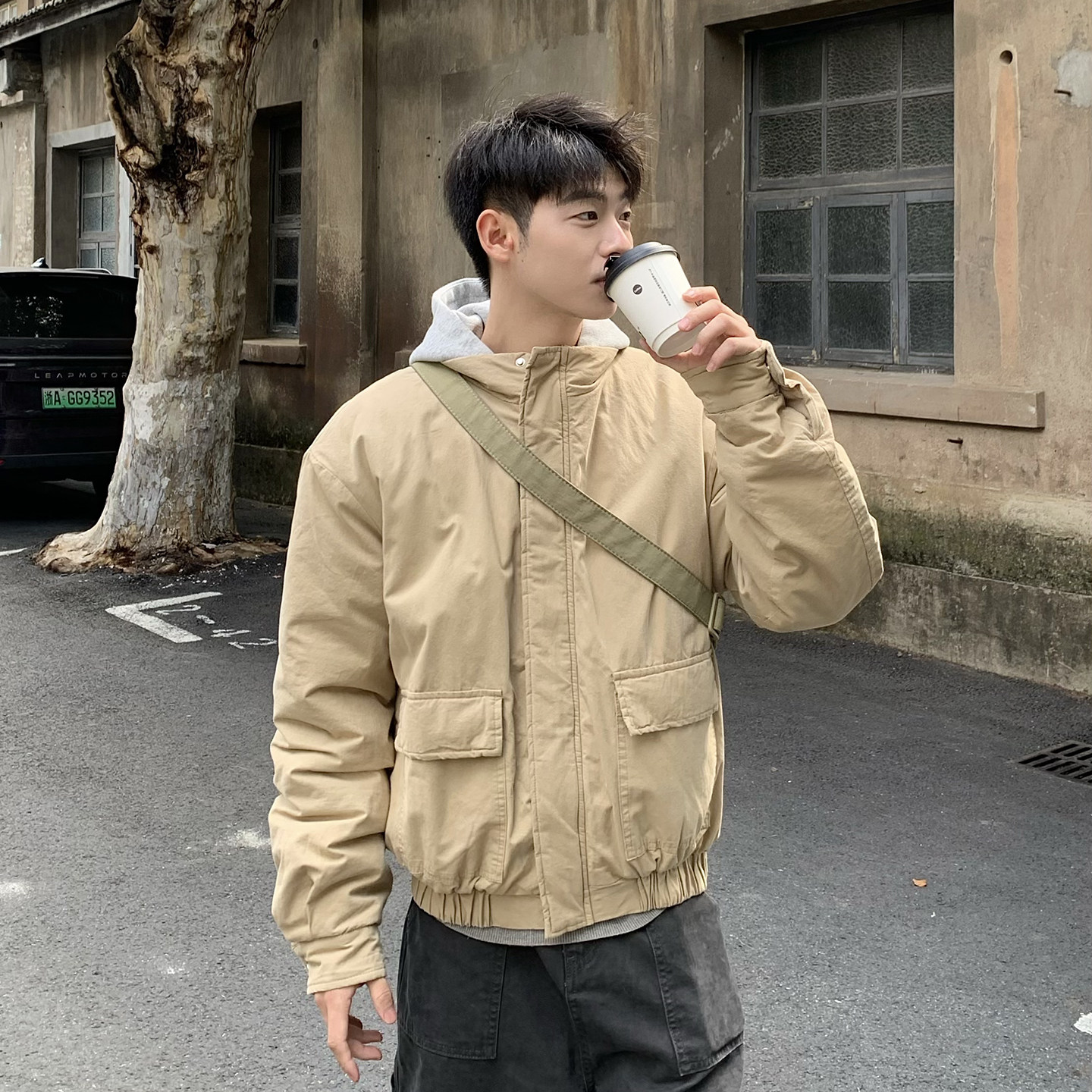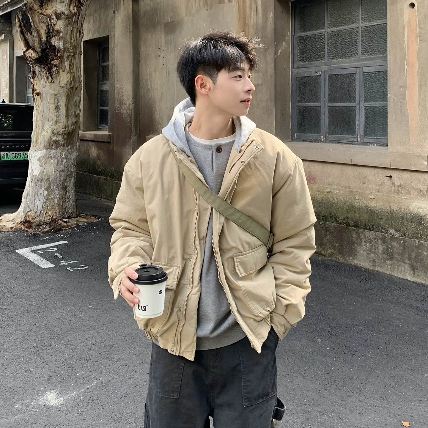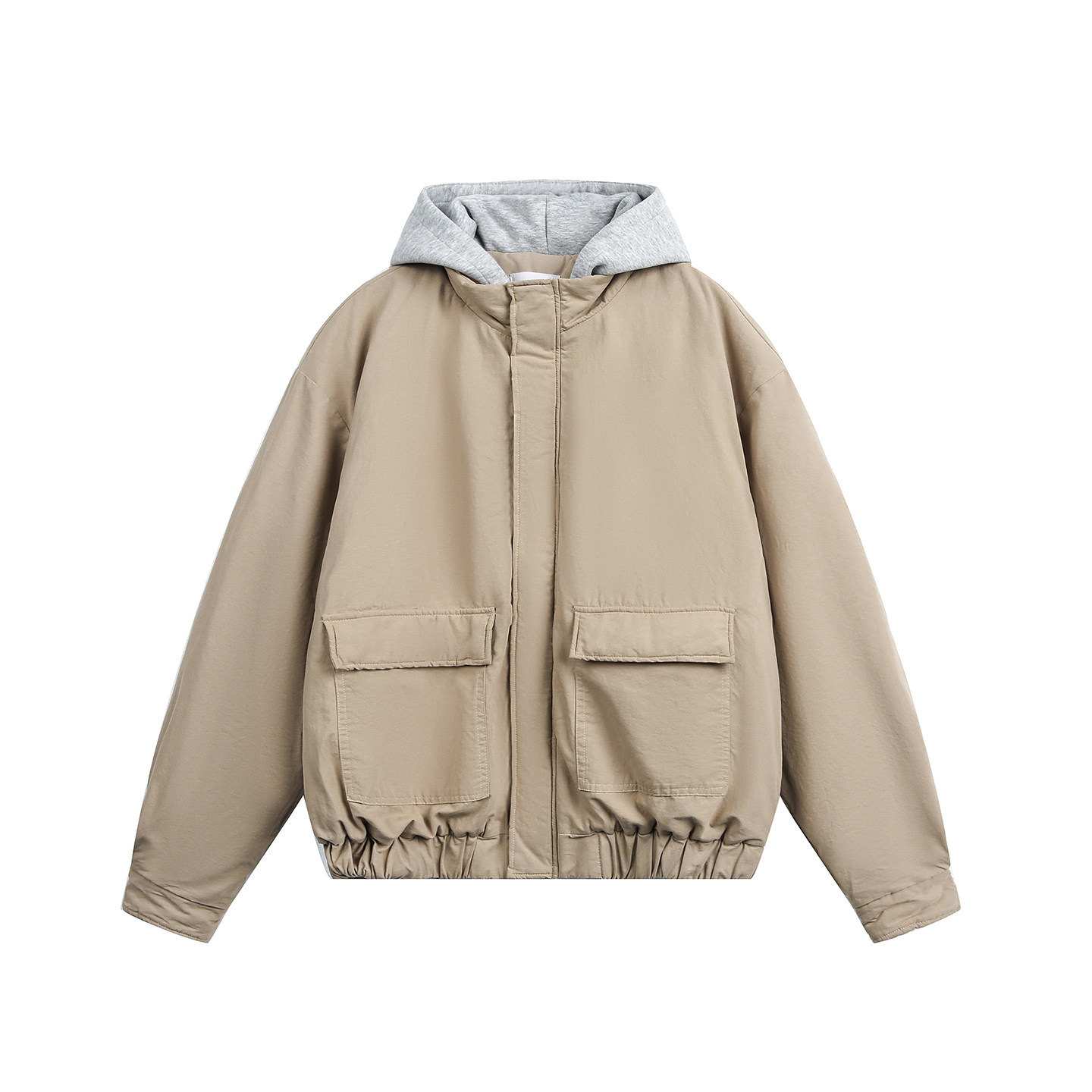美式连帽假两件短款工装夹克棉服男2025新款冬季加厚保暖棉衣外套