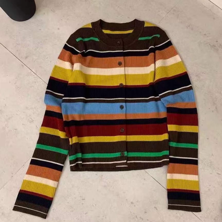 2025冬季时尚百搭圆领撞色条纹长袖针织开衫女正品毛衣上衣62583