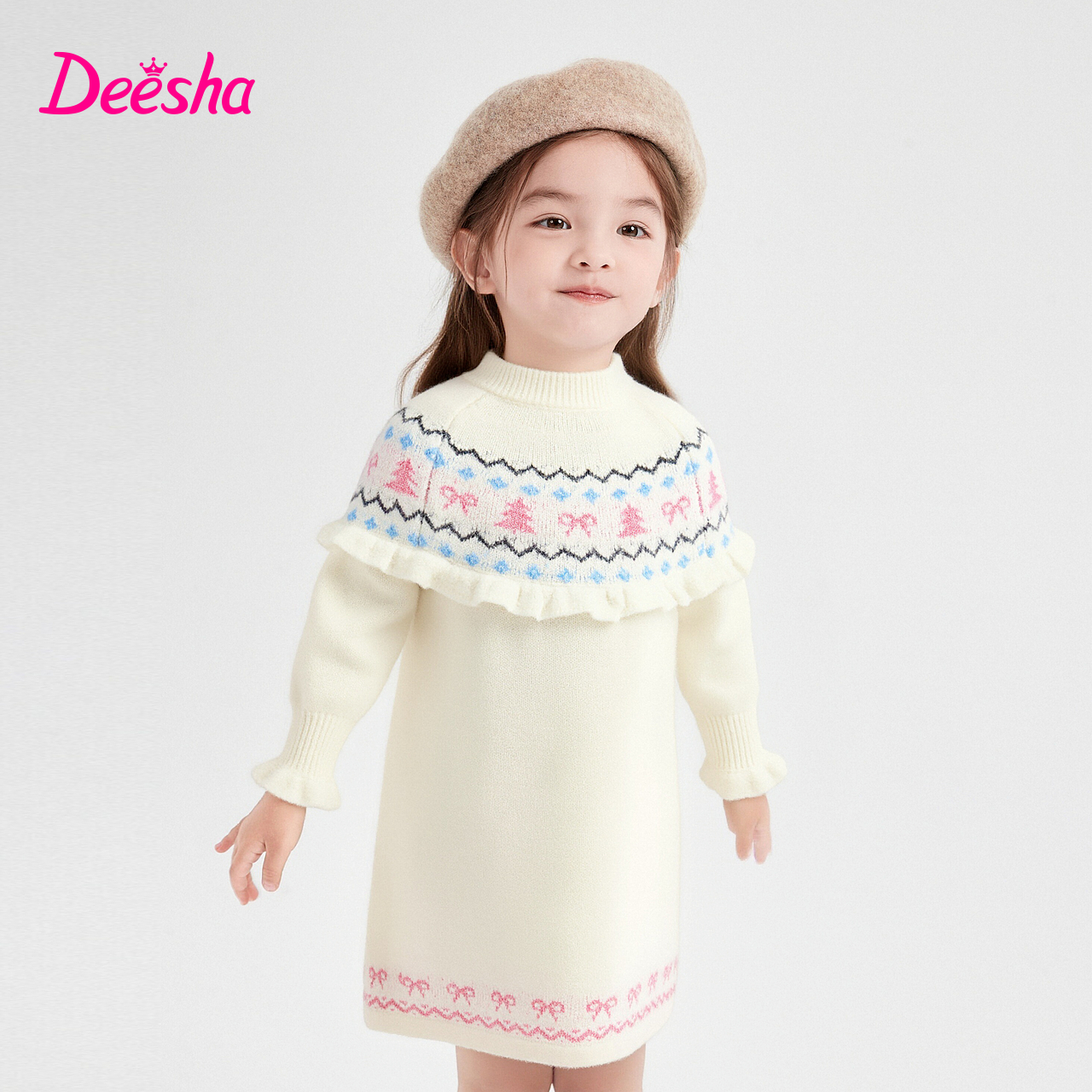 笛莎童装女童针织裙冬季新款儿童女孩宝宝毛衣裙红色新年服连衣裙