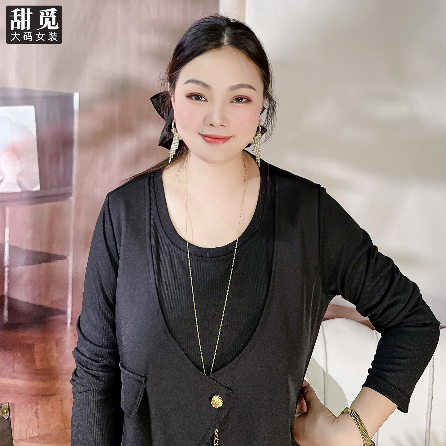 甜觅特大码女装2025秋装胖mm300斤气质通勤假两件中长款圆领T恤