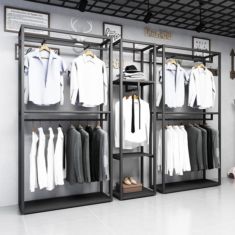 需定制黑色服装店展示架男装店铺货架落地式双层陈列挂衣架铁艺金