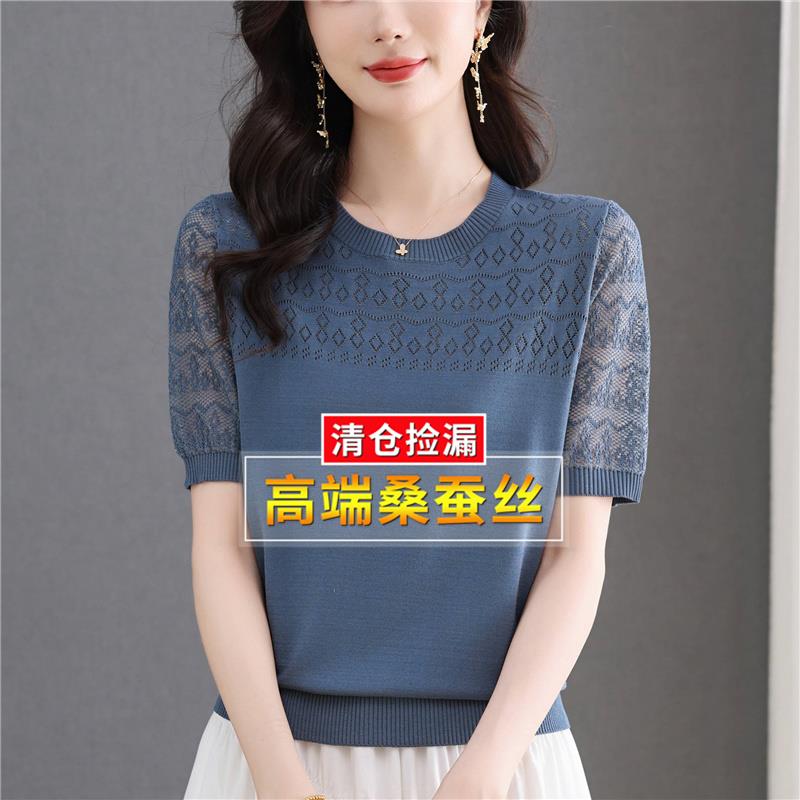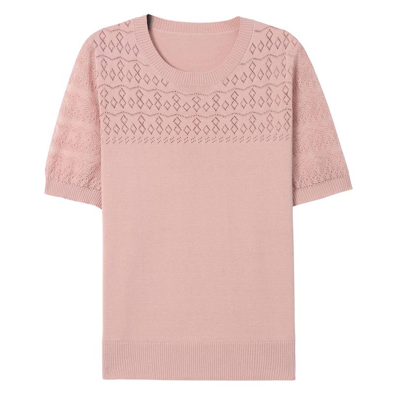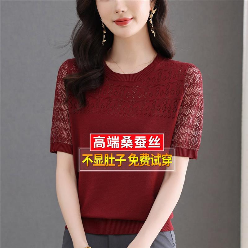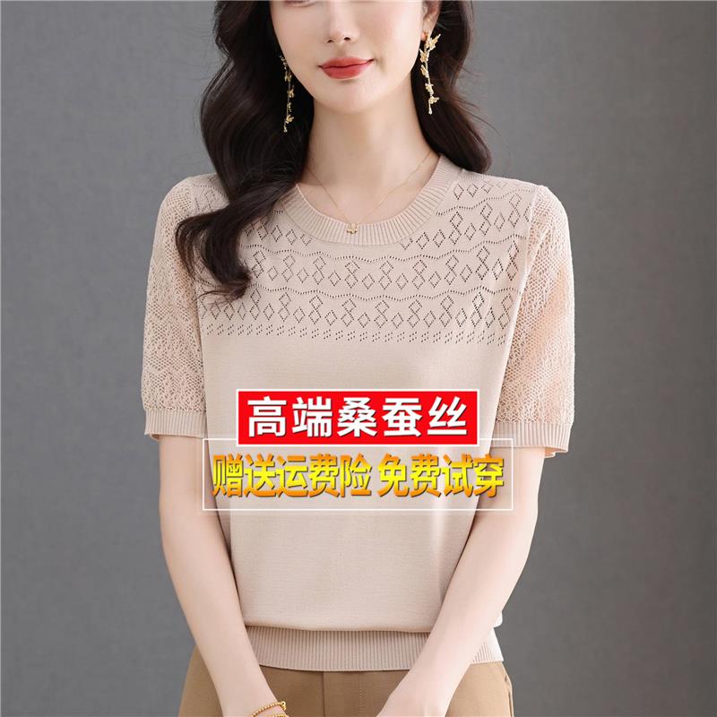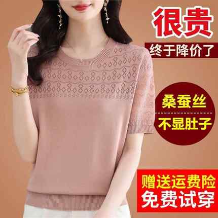 妈妈夏装桑蚕丝短袖体t恤女宽松针织冰丝半袖粉色镂空上衣小衫薄