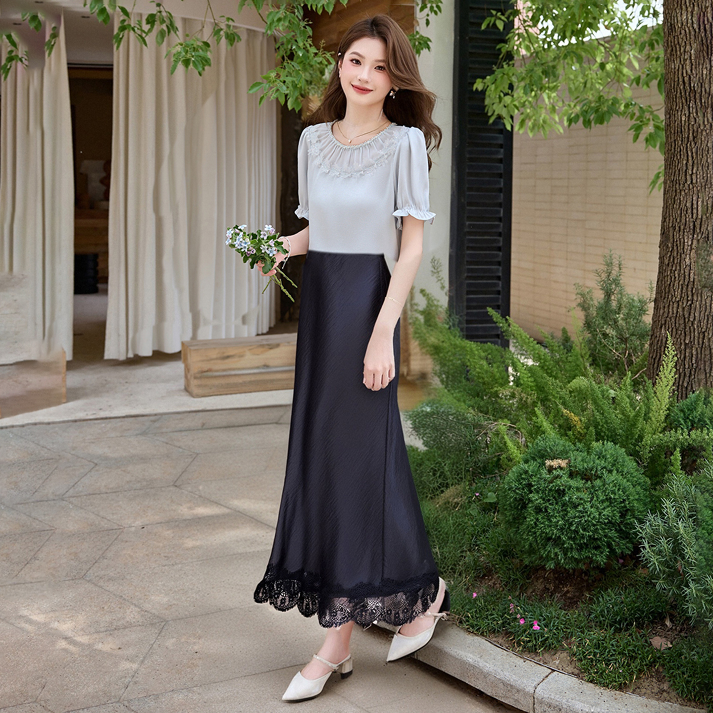 25夏季新款时尚洋气重工钉珠上衣蕾丝边半身裙休闲百搭显瘦两件套