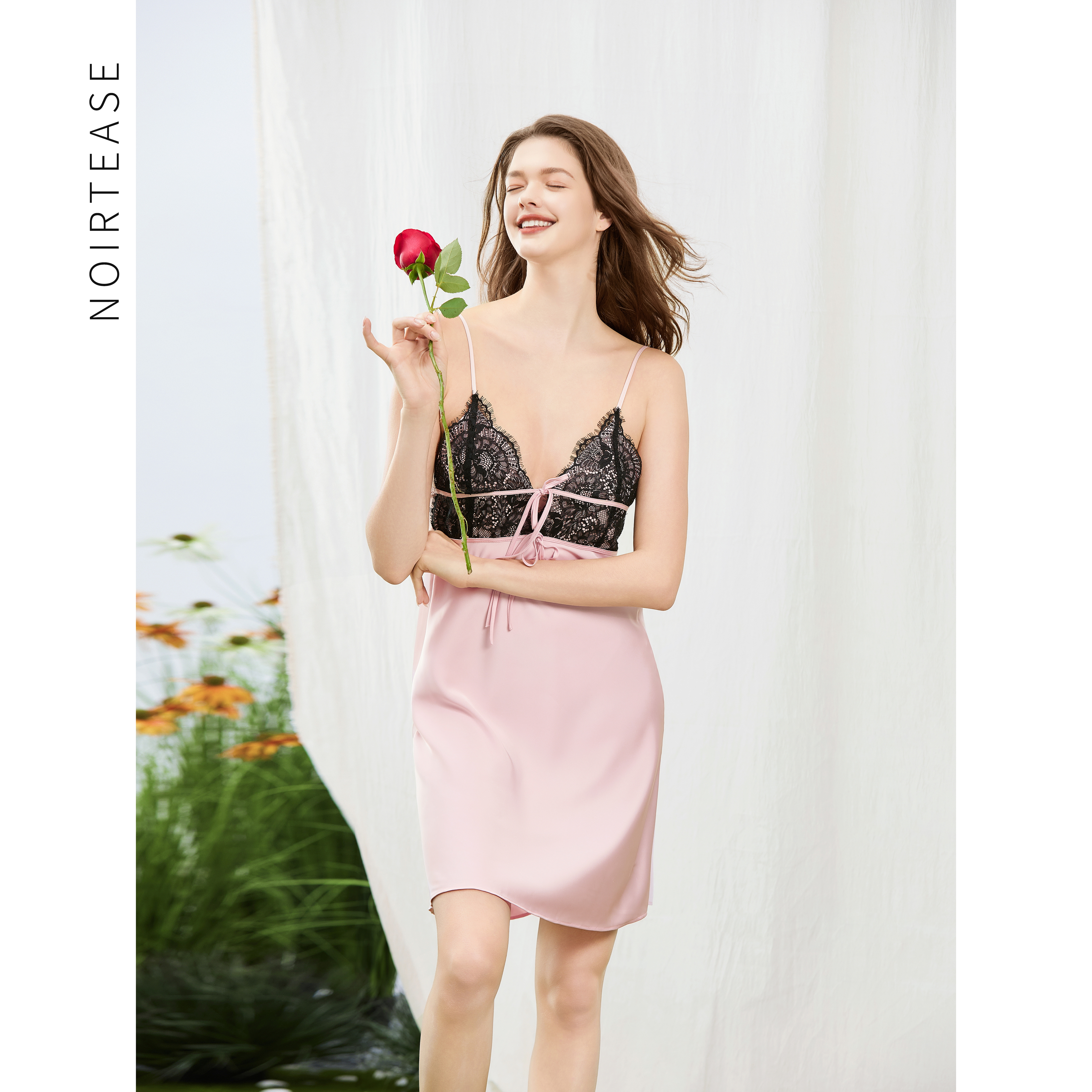 NoirTease夏季新款薄款丝质睡裙女士性感蕾丝V领短款吊带裙家居服