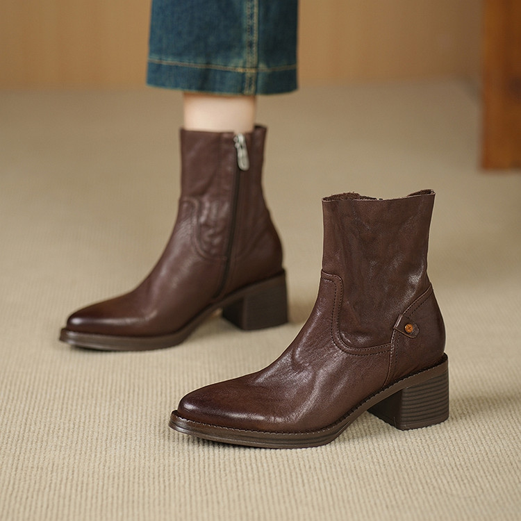 法式复古中跟短靴女2025新款真皮圆头短筒单靴侧拉链马丁靴子