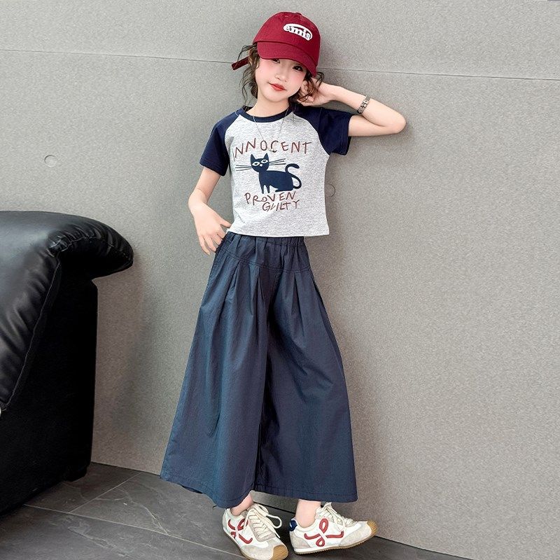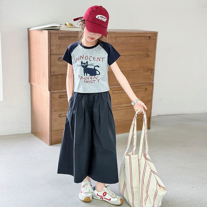 女童夏套装2e025新款洋派夏装儿童短袖T恤女大童阔腿裤薄款两件套